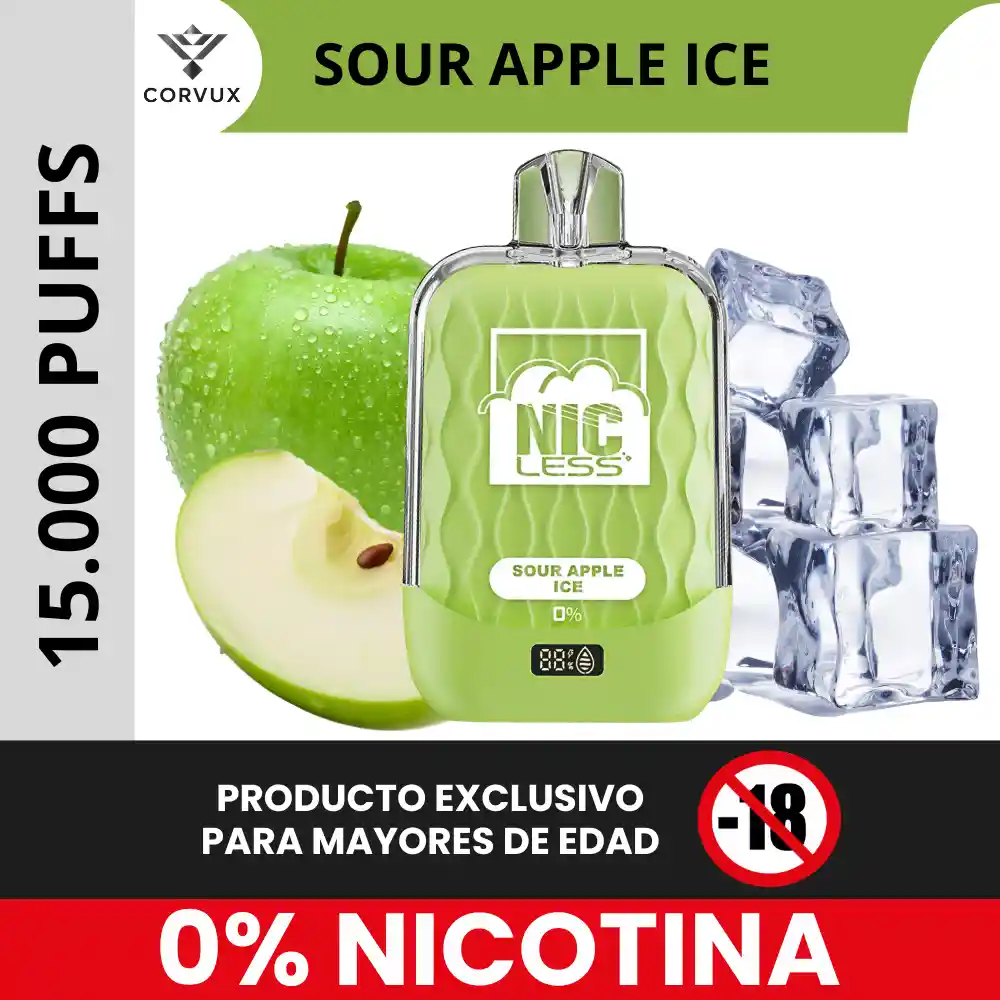 PROHIBIDA LA VENTA A MENORES DE EDAD. PRODUCTO EXCLUSIVO PARA MAYORES DE EDAD. ANTES DE CONSUMIR, CONSULTE LAS INDICACIONES Y CONTRAINDICACIONES DE USO. El Nic Less NC15000 es un dispositivo desechable de gran autonomía diseñado para usuarios que buscan una experiencia prolongada y consistente sin nicotina. Su versión Sour Apple Ice combina la acidez característica de la manzana verde con un efecto frío moderado, ofreciendo un perfil crujiente y refrescante. ✦ Notas principales: Predominan las notas de manzana verde ácida, con un sabor nítido y un toque jugoso que recuerda a fruta fresca tipo Granny Smith. ✦ Contrastes: El componente ácido se equilibra con una frescura tipo ice, que suaviza la intensidad de la manzana y deja un acabado frío y limpio en el paladar. ✦ Experiencia sensorial: Durante la inhalación, el dispositivo entrega un impacto frutal ácido inmediato, con vapor de densidad media que distribuye el sabor de forma uniforme. El golpe en garganta es suave, propio de un dispositivo sin nicotina, permitiendo que el perfil ácido destaque sin generar irritación. En la exhalación, el efecto helado se hace más presente, generando una sensación fresca y ligera, mientras el sabor a manzana decrece hacia un retrogusto limpio y frío. El dispositivo mantiene un flujo de vapor estable gracias a su diseño de malla y su batería recargable, lo que permite conservar la constancia del sabor durante toda su vida útil. ✦ Ideal para: Personas que buscan un perfil ácido–refrescante sin nicotina, en un dispositivo de alta duración y mantenimiento mínimo. ⚙️ Especificaciones técnicas: ✦ Caladas estimadas: ~15 000. ✦ E-líquido prellenado: ~16 ml. ✦ Batería: ~650 mAh recargable por USB-C. ✦ Nicotina: 0% (libre de nicotina). ✦ Sistema: bobina/malla para vapor estable y sabor consistente. PROHIBIDA LA VENTA A MENORES DE EDAD. PRODUCTO EXCLUSIVO PARA MAYORES DE EDAD. ANTES DE CONSUMIR, CONSULTE LAS INDICACIONES Y CONTRAINDICACIONES DE USO.