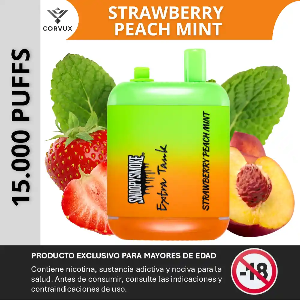 PROHIBIDA LA VENTA A MENORES DE EDAD. PRODUCTO EXCLUSIVO PARA MAYORES DE EDAD, CONTIENE NICOTINA, SUSTANCIA ADICTIVA Y NOCIVA PARA LA SALUD. ANTES DE CONSUMIR, CONSULTE LAS INDICACIONES Y CONTRAINDICACIONES DE USO. Snoopy Smoke 15000 – Strawberry Peach Mint es un vape desechable de alto rendimiento con sistema de doble tanque prellenado con e-líquido, diseñado para ofrecer una experiencia duradera de hasta 15 000 caladas sin necesidad de rellenar. El dispositivo incluye batería recargable con puerto USB-C, activación por inhalación y bobina de malla para una producción uniforme de vapor. ✨ Perfil del sabor ✦ Notas principales: Combinación frutal de fresa madura y durazno jugoso, acompañada de un toque mentolado fresco. ✦ Contrastes: el dulzor Afrutado de la fresa y el durazno se cruzan con la frescura sutil de la menta, equilibrando el perfil general. ✦ Experiencia sensorial: Mezcla frutal suave con un acabado ligeramente refrescante que aporta sensación de frescura sin ser dominante. ✦ Ideal para: Quienes prefieren perfiles frutales dulces con un matiz mentolado que añade un punto ligero de frescura. 📋 Especificaciones técnicas ✦ Caladas aproximadas: Caladas aproximadas: Más de 15 000 puffs con una sola unidad. ✦ Capacidad de e-líquido: 36 ml en total (dos tanques de 18 ml cada uno). ✦ Concentración de nicotina: 5 % (50 mg) de sales de nicotina. ✦ Batería: 650 mAh, recargable mediante USB-C. ✦ Sistema de tanques: Dual Tank, permite cambiar de tanque cuando uno se agota. ✦ Coil / Calentador: Malla (mesh coil) para producción constante de vapor. ✦ Funcionamiento: Activación por tiro (draw-activated), sin botones adicionales. PROHIBIDA LA VENTA A MENORES DE EDAD. PRODUCTO EXCLUSIVO PARA MAYORES DE EDAD, CONTIENE NICOTINA, SUSTANCIA ADICTIVA Y NOCIVA PARA LA SALUD. ANTES DE CONSUMIR, CONSULTE LAS INDICACIONES Y CONTRAINDICACIONES DE USO.