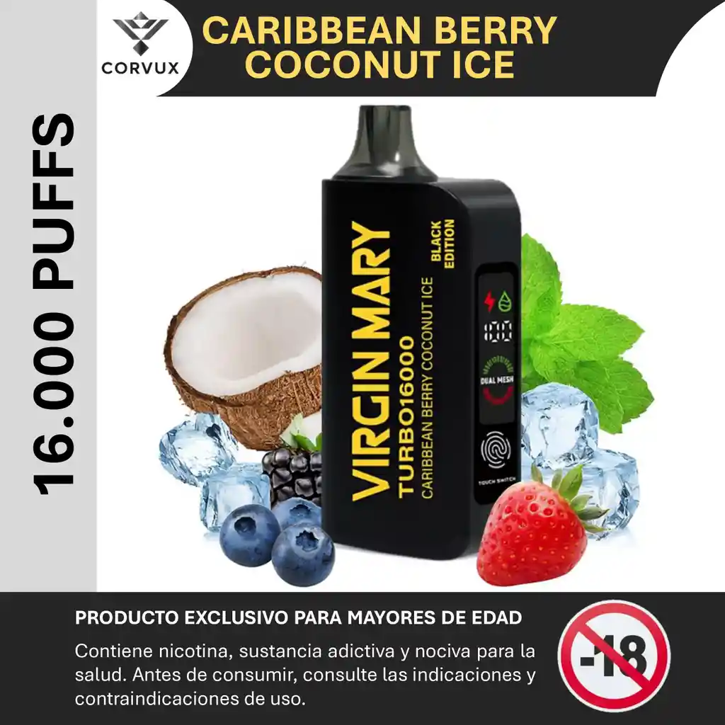 PROHIBIDA LA VENTA A MENORES DE EDAD. PRODUCTO EXCLUSIVO PARA MAYORES DE EDAD, CONTIENE NICOTINA, SUSTANCIA ADICTIVA Y NOCIVA PARA LA SALUD. ANTES DE CONSUMIR, CONSULTE LAS INDICACIONES Y CONTRAINDICACIONES DE USO. Vape Virgin Mary - Caribbean Berry Coconut Ice - Hasta 16,000 bocanadas - Control de flujo de aire ajustable - 50 mg/ml de nicotina - Batería de 650 mAh - Pantalla LED - Carga rápida Tipo C - Tecnología de bobina de malla doble
