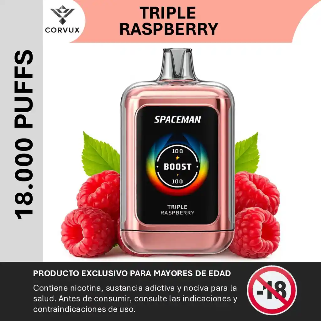 PROHIBIDA LA VENTA A MENORES DE EDAD. PRODUCTO EXCLUSIVO PARA MAYORES DE EDAD, CONTIENE NICOTINA, SUSTANCIA ADICTIVA Y NOCIVA PARA LA SALUD. ANTES DE CONSUMIR, CONSULTE LAS INDICACIONES Y CONTRAINDICACIONES DE USO. Vape Spaceman - Triple Raspberry - Tipo desechable - Recuento de bocanadas: hasta 18000 bocanadas - Fuerza de nicotina: 50 mg (5%) - Tamaño de la batería: 1000 mAh incorporados - Puerto de carga: USB tipo C - Dimensiones: 79 mm x 51 mm x 27,5 mm - Características principales: 3 modos de salida (Boost, Norm, Soft) - Batería y pantalla de E-líquido 3 temas y animaciones seleccionables