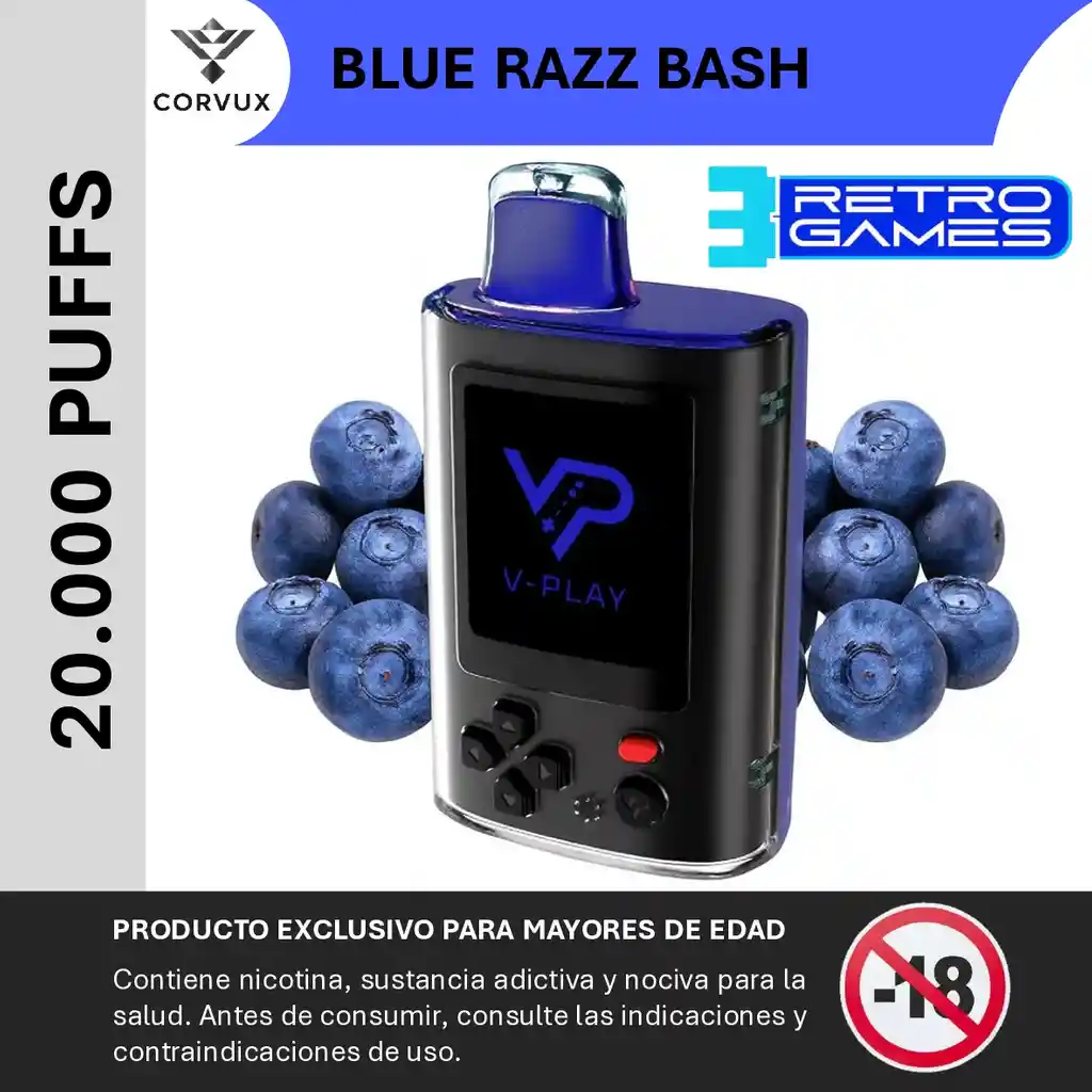 PROHIBIDA LA VENTA A MENORES DE EDAD. PRODUCTO EXCLUSIVO PARA MAYORES DE EDAD, CONTIENE NICOTINA, SUSTANCIA ADICTIVA Y NOCIVA PARA LA SALUD. ANTES DE CONSUMIR, CONSULTE LAS INDICACIONES Y CONTRAINDICACIONES DE USO. Vape Vplay - Bluerazz Bash Incluye 3 juegos Retro Pantalla: LED de 1.77 pulgadas Nicotina: 5% Capacidad de e-líquido: 25ml Capacidad de la batería: 850mAh Puffs: 20,000 Puerto de carga USB Tipo-C