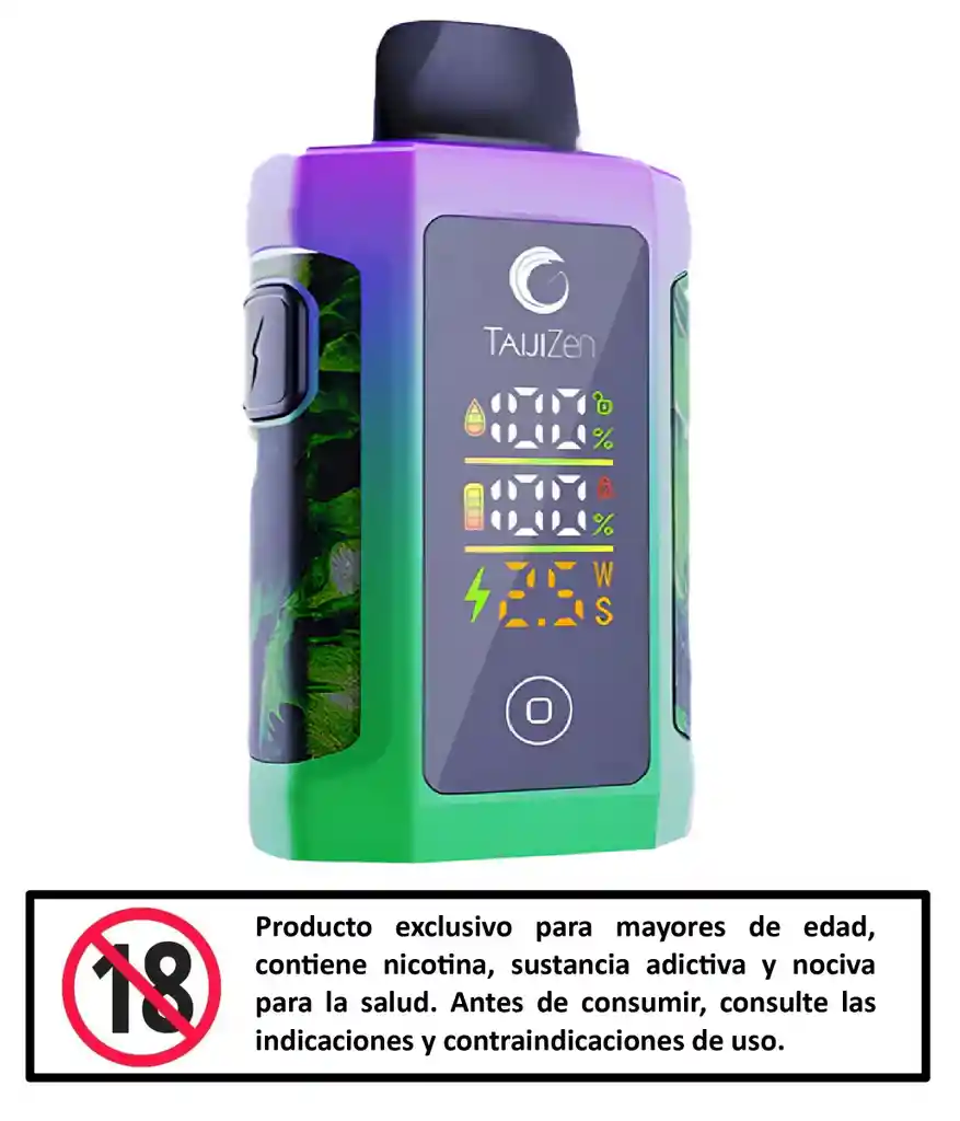 PROHIBIDA LA VENTA A MENORES DE EDAD. PRODUCTO EXCLUSIVO PARA MAYORES DE EDAD, CONTIENE NICOTINA, SUSTANCIA ADICTIVA Y NOCIVA PARA LA SALUD. ANTES DE CONSUMIR, CONSULTE LAS INDICACIONES Y CONTRAINDICACIONES DE USO. Vape Taijizen Judo - Lemon Peach Passion Fruit - Respuesta ultra rápida: ¡Ignición en solo 0.0001 segundos! - Potencia personalizable: Modo Boost de 25W (12,000 puffs), Modo Normal de 15W (24,000 puffs). - Bobina de malla dual de 0.5 ohmios. - Batería recargable de 850mAh. - Puerto de carga rápida Tipo-C. - Ajuste de potencia y flujo de aire. - Pantalla táctil de 2.7 pulgadas. - Capacidad de e-líquido: 25 ml . - Soporta e-líquidos con 5% de sales de nicotina.