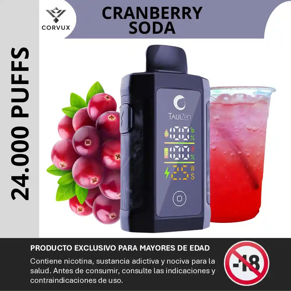PROHIBIDA LA VENTA A MENORES DE EDAD. PRODUCTO EXCLUSIVO PARA MAYORES DE EDAD, CONTIENE NICOTINA, SUSTANCIA ADICTIVA Y NOCIVA PARA LA SALUD. ANTES DE CONSUMIR, CONSULTE LAS INDICACIONES Y CONTRAINDICACIONES DE USO. 🍒🥤❄️ Arándanos ácidos combinados con soda chispeante, con un toque frío que potencia la sensación de bebida efervescente — refrescante, vibrante y distintiva. Dispositivo: iJoy TaijiZen Judo 24 000 Puffs Sabor: Cranberry Soda ✨ Perfil del sabor ✦ Notas principales: Una base marcada de arándano/cranberry ‘tart’, con dulzor moderado que lo equilibra y una fusión con agua de soda espumosa, creando una nota gaseosa y refrescante. ✦ Contrastes: El efecto ice es medio-alto: refresca sin volverse mentolado extremo, permitiendo que el carácter de la soda chispee y se sienta la efervescencia. Final limpio, con sensación de bebida fría al paladar. ✦ Experiencia sensorial: Inhalación inicial con sabor agrio-dulce al cranberry, sensación de burbujas o efervescencia ligera; exhalación más fría con chispa soda que limpia el paladar. El retrogusto prolongado es frutal-cítrico con frescura residual, ideal para quien busca un sabor distinto, con carácter de “bebida premium”. ✦ Ideal para: Quienes prefieren sabores frutales con un twist gaseoso/efervescente, que buscan refrescancia compleja más allá de la simple fruta o menta. Perfecto para quienes quieren una experiencia tipo «bebida de cóctel sin alcohol» dentro del segmento vape, con carácter y estilo. 📋 Especificaciones técnicas ✦ Capacidad de e-líquido: 25 mL (pre-llenado) ✦ Nivel de nicotina: 5 % (≈ 50 mg/mL) — nicotina tipo sal ✦ Puffs estimados: Hasta ≈ 24 000 en modo normal (15 W) / hasta ≈ 12 000 en modo boost (25 W) ✦ Batería: 850 mAh recargable vía USB Tipo-C ⚡ ✦ Pantalla / interfaz: Pantalla táctil HD de ~2.7" que muestra e-líquido restante, batería, modo. ✦ Flujo de aire: Ajustable (selector integrado) ✦ Resistencia (coil): Malla doble (dual mesh) ~0.5 Ω para sabor y vapor uniforme ✦ Activación: Automática por succión (draw-activated) con opción de modos de potencia 15W/25W PROHIBIDA LA VENTA A MENORES DE EDAD. PRODUCTO EXCLUSIVO PARA MAYORES DE EDAD, CONTIENE NICOTINA, SUSTANCIA ADICTIVA Y NOCIVA PARA LA SALUD. ANTES DE CONSUMIR, CONSULTE LAS INDICACIONES Y CONTRAINDICACIONES DE USO.