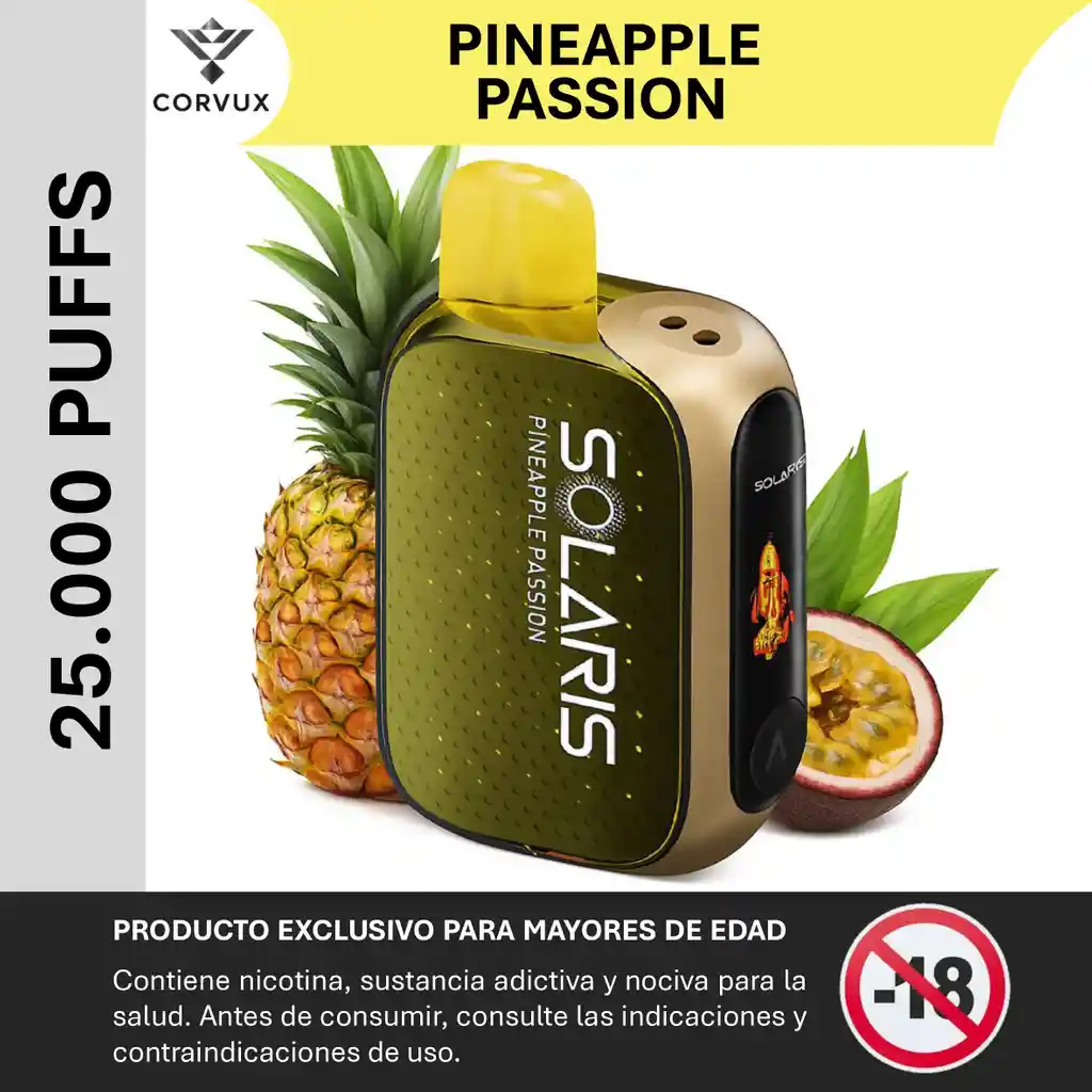 PROHIBIDA LA VENTA A MENORES DE EDAD. PRODUCTO EXCLUSIVO PARA MAYORES DE EDAD, CONTIENE NICOTINA, SUSTANCIA ADICTIVA Y NOCIVA PARA LA SALUD. ANTES DE CONSUMIR, CONSULTE LAS INDICACIONES Y CONTRAINDICACIONES DE USO. Vape Solaris - Pineapple Passion - Carga solar y tipo C. - 25,000 puffs. - Batería recargable de 700 mAh. - Nicotina al 5%. - Pantalla HD. - Modos Normal y Boost. - Ajuste de flujo de aire.