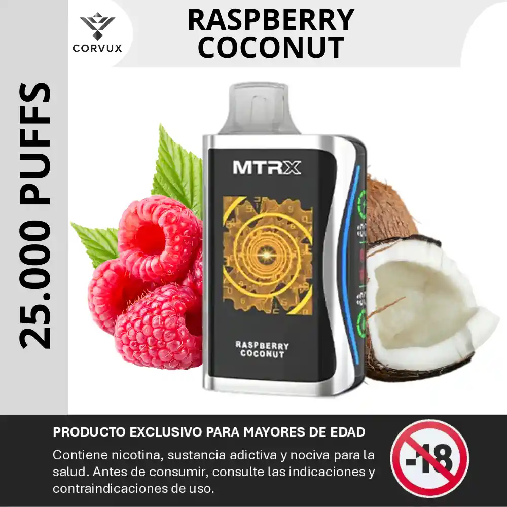 PROHIBIDA LA VENTA A MENORES DE EDAD. PRODUCTO EXCLUSIVO PARA MAYORES DE EDAD, CONTIENE NICOTINA, SUSTANCIA ADICTIVA Y NOCIVA PARA LA SALUD. ANTES DE CONSUMIR, CONSULTE LAS INDICACIONES Y CONTRAINDICACIONES DE USO. El MTRX MX 25000 - Raspberry Coconut, combina un perfil frutal-cremoso que mezcla la dulzura de la frambuesa con la suavidad del coco. Notas principales: Notas de frambuesa dulce y jugosa, con su carácter frutal vibrante, acompañadas por toques de coco cremoso que aportan suavidad y redondez al perfil. Contrastes: La acidez frutal de la frambuesa se suaviza con la cremosidad del coco, generando un equilibrio entre lo fresco y lo dulce — un perfil afrutado-cremoso que evita extremos de acidez o dulzor excesivo. Experiencia sensorial: Al inhalar, el vapor ofrece una entrada frutal intensa, con la frambuesa claramente perceptible y un vapor de densidad media-alta gracias al sistema quad mesh coil. El golpe en garganta es medio, característico de la concentración estándar de nicotina en este modelo. Durante la exhalación, se percibe cómo emerge la nota cremosa de coco, redondeando la mezcla y dejando un retrogusto suave y afrutado-cremoso con un final equilibrado. El vapor se mantiene estable durante muchas caladas, gracias al depósito de 20 ml y la batería recargable. Ideal para: Personas que buscan un perfil afrutado-dulce con matiz cremoso, con un sabor definido pero balanceado, en un dispositivo de larga duración, con vapor constante y procesamiento sencillo. ⚙️ Especificaciones técnicas: ✦ Caladas estimadas: ~25 000 puffs ✦ E-líquido prellenado: 20 ml ✦ Batería: Recargable 900 mAh (USB-C) ✦ Resistencia: Quad mesh coil (malla cuádruple), con cambio automático de dual coils cada ~10 segundos ✦ Flujo de aire: Ajustable ✦ Nicotina: 5 % (50 mg/ml), según ficha estándar del modelo. PROHIBIDA LA VENTA A MENORES DE EDAD. PRODUCTO EXCLUSIVO PARA MAYORES DE EDAD, CONTIENE NICOTINA, SUSTANCIA ADICTIVA Y NOCIVA PARA LA SALUD. ANTES DE CONSUMIR, CONSULTE LAS INDICACIONES Y CONTRAINDICACIONES DE USO.