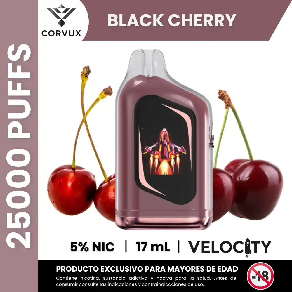 PROHIBIDA LA VENTA A MENORES DE EDAD. PRODUCTO EXCLUSIVO PARA MAYORES DE EDAD, CONTIENE NICOTINA, SUSTANCIA ADICTIVA Y NOCIVA PARA LA SALUD. ANTES DE CONSUMIR, CONSULTE LAS INDICACIONES Y CONTRAINDICACIONES DE USO. El Velocity 25000 Puffs es un dispositivo desechable con diseño compacto y pantalla HD, pensado para ofrecer una duración prolongada y personalización en la experiencia. El dispositivo permite hasta 25 000 puffs, incluye tres modos de funcionamiento (Boost, Normal y Eco) y una capacidad de e-líquido de 17 ml con 5 % de nicotina. 🍒 Perfil de Sabor — Black Cherry ✦ Notas principales: Dulce de cereza profunda y madura, con cuerpo frutal clásico. ✦ Contrastes: Equilibrio entre dulzor y una ligera acidez que evita que resulte empalagoso. ✦ Experiencia sensorial: Sensación afrutada intensa y redonda, con un final suave y persistente. ✦ Ideal para: Personas que buscan un perfil frutal marcado y consistente. 🔧 Especificaciones Técnicas ✦ Puffs estimados: Hasta 25 000 caladas. ✦ Capacidad de e-líquido: 17 ml. ✦ Nivel de nicotina: 5 % (50 mg). ✦ Modos de uso: Boost, Normal y Eco. ✦ Pantalla: Mega HD con animaciones. ✦ Batería y carga: Integrada con puerto Tipo-C. PROHIBIDA LA VENTA A MENORES DE EDAD. PRODUCTO EXCLUSIVO PARA MAYORES DE EDAD, CONTIENE NICOTINA, SUSTANCIA ADICTIVA Y NOCIVA PARA LA SALUD. ANTES DE CONSUMIR, CONSULTE LAS INDICACIONES Y CONTRAINDICACIONES DE USO.
