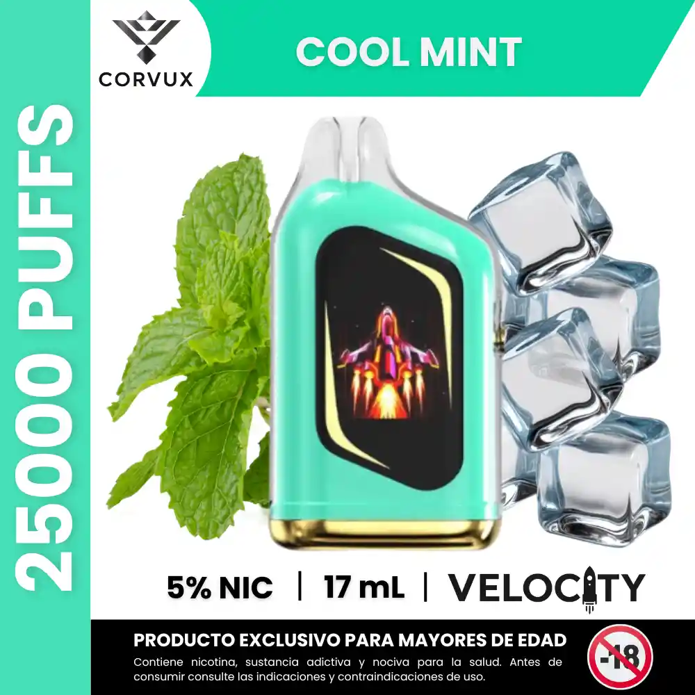 PROHIBIDA LA VENTA A MENORES DE EDAD. PRODUCTO EXCLUSIVO PARA MAYORES DE EDAD, CONTIENE NICOTINA, SUSTANCIA ADICTIVA Y NOCIVA PARA LA SALUD. ANTES DE CONSUMIR, CONSULTE LAS INDICACIONES Y CONTRAINDICACIONES DE USO. El Velocity 25000 Puffs es un dispositivo desechable de alta capacidad con 17 ml de e-líquido precargado y concentración de nicotina de 5 % (50 mg). Está diseñado con tres modos de funcionamiento (Boost, Normal y Eco), pantalla Mega HD y batería recargable con puerto Tipo-C, ofreciendo hasta unas 25 000 puffs estimados según especificaciones de producto. El sabor Cool Mint se ubica dentro de la categoría mentolada/refrescante, aportando sensaciones claras y nítidas de hierbabuena frías que contrastan con perfiles más dulces del resto de la gama. 🍃 Perfil de sabor – Cool Mint ✦ Notas principales: Mentol fresco con matices limpios y verdes característicos de hierbabuena o menta fresca. ✦ Contrastes: El frescor marcado del mentol destaca frente a cualquier dulzor residual del e-líquido, generando un perfil simple y refrescante. ✦ Experiencia sensorial: Sensación fría y continua que transmite un efecto de “brisa” mentolada sin perfiles frutales complejos. ✦ Ideal para: Personas interesadas en un perfil refrescante y directo con predominancia de menta/mentol. 🔧 Especificaciones Técnicas ✦ Puffs estimados: Hasta 25 000 caladas. ✦ Capacidad de e-líquido: 17 ml. ✦ Nivel de nicotina: 5 % (50 mg). ✦ Modos de uso: Boost, Normal y Eco. ✦ Pantalla: Mega HD con animaciones. ✦ Batería y carga: Integrada con puerto Tipo-C. PROHIBIDA LA VENTA A MENORES DE EDAD. PRODUCTO EXCLUSIVO PARA MAYORES DE EDAD, CONTIENE NICOTINA, SUSTANCIA ADICTIVA Y NOCIVA PARA LA SALUD. ANTES DE CONSUMIR, CONSULTE LAS INDICACIONES Y CONTRAINDICACIONES DE USO.