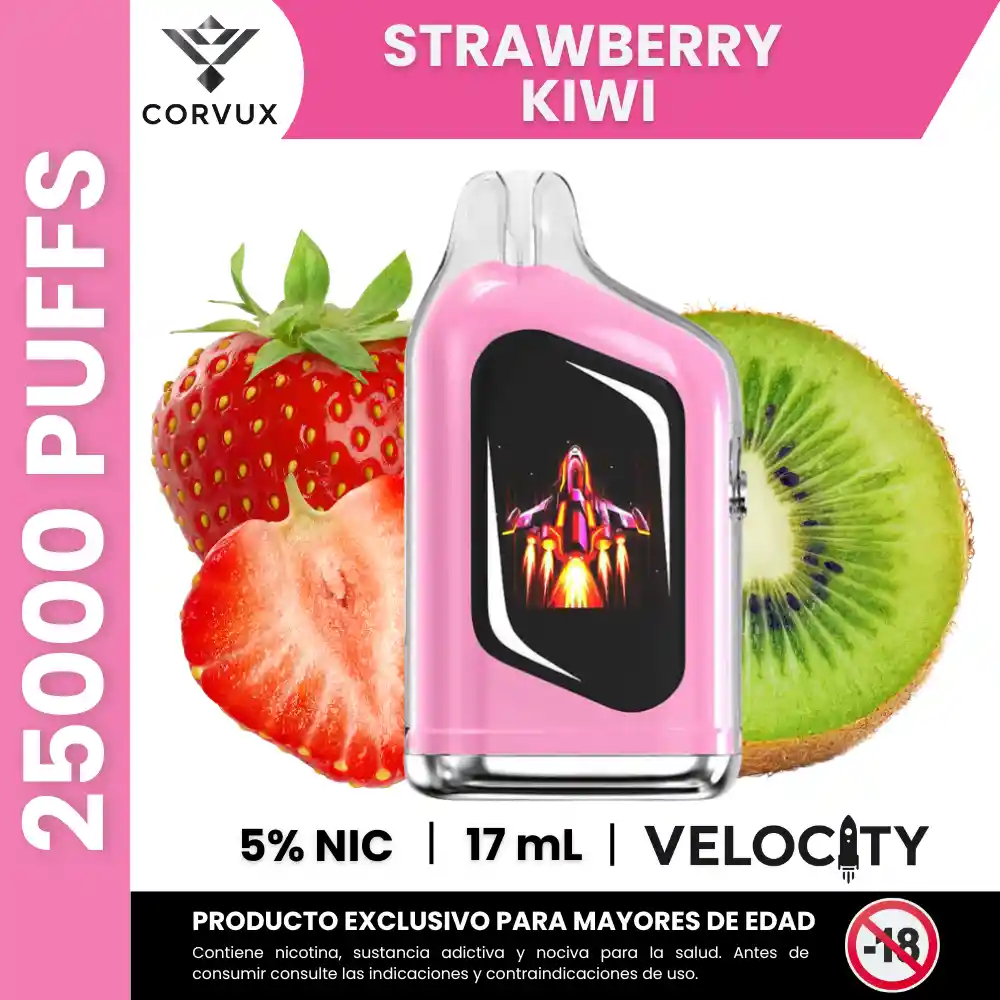 PROHIBIDA LA VENTA A MENORES DE EDAD. PRODUCTO EXCLUSIVO PARA MAYORES DE EDAD, CONTIENE NICOTINA, SUSTANCIA ADICTIVA Y NOCIVA PARA LA SALUD. ANTES DE CONSUMIR, CONSULTE LAS INDICACIONES Y CONTRAINDICACIONES DE USO. El Velocity 25000 Puffs es un dispositivo desechable de alta capacidad con aproximadamente 25 000 puffs, 17 ml de e-líquido precargado y 5 % de nicotina (50 mg). Está equipado con tres modos de uso (Boost, Normal y Eco), una pantalla HD interactiva y carga Tipo-C, ofreciendo características técnicas avanzadas para este tipo de dispositivo desechable. El sabor Strawberry Kiwi combina perfiles frutales clásicos de fresa y kiwi, resultando en una mezcla dulce-ligera con un toque de acidez natural similar al de estas frutas. 🍓 Perfil de sabor – Strawberry Kiwi ✦ Notas principales: Fresa dulce con matices de kiwi fresco y ligeramente ácido. ✦ Contrastes: El dulzor de la fresa se equilibra con la ligera acidez y toque verde del kiwi. ✦ Experiencia sensorial: Perfil afrutado con sensación jugosa y balance entre notas dulces y cítricas suaves. ✦ Ideal para: Personas interesadas en sabores frutales clásicos con perfiles sencillos y agradables. 🔧 Especificaciones Técnicas ✦ Puffs estimados: Hasta 25 000 caladas. ✦ Capacidad de e-líquido: 17 ml. ✦ Nivel de nicotina: 5 % (50 mg). ✦ Modos de uso: Boost, Normal y Eco. ✦ Pantalla: Mega HD con animaciones. ✦ Batería y carga: Integrada con puerto Tipo-C. PROHIBIDA LA VENTA A MENORES DE EDAD. PRODUCTO EXCLUSIVO PARA MAYORES DE EDAD, CONTIENE NICOTINA, SUSTANCIA ADICTIVA Y NOCIVA PARA LA SALUD. ANTES DE CONSUMIR, CONSULTE LAS INDICACIONES Y CONTRAINDICACIONES DE USO.