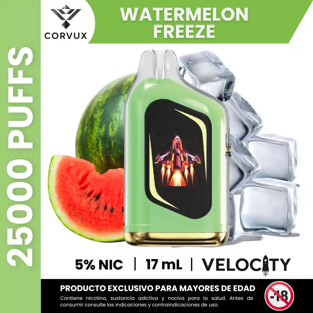 PROHIBIDA LA VENTA A MENORES DE EDAD. PRODUCTO EXCLUSIVO PARA MAYORES DE EDAD, CONTIENE NICOTINA, SUSTANCIA ADICTIVA Y NOCIVA PARA LA SALUD. ANTES DE CONSUMIR, CONSULTE LAS INDICACIONES Y CONTRAINDICACIONES DE USO. El Velocity 25000 Puffs es un dispositivo desechable de alto rendimiento con una capacidad de e-líquido de 17 ml y una concentración de 5 % de nicotina (50 mg) precargada. Cuenta con tres modos de uso (Boost, Normal y Eco), pantalla Mega HD con animaciones interactivas, tecnología de bobinas de malla dual y carga Tipo-C, diseñado para ofrecer hasta 25 000 puffs estimados según especificaciones técnicas del producto. El sabor Watermelon Freeze combina perfil de sandía con un toque fresco inspirando una sensación “congelada”, integrando notas frutales y matices mentolados livianos para un perfil refrescante. 🍉 Perfil de sabor – Watermelon Freeze ✦ Notas principales: Sandía jugosa con matices de frescura tipo helado o efecto “freeze”. ✦ Contrastes: El dulzor natural de la sandía contrasta con un acabado fresco-mentolado que suaviza el perfil. ✦ Experiencia sensorial: Sensación frutal con un matiz refrescante que aporta ligereza y una sensación “fría”. ✦ Ideal para: Consumidores que prefieren perfiles frutales ligeros con un toque de frescura. 🔧 Especificaciones Técnicas ✦ Puffs estimados: Hasta 25 000 caladas. ✦ Capacidad de e-líquido: 17 ml. ✦ Nivel de nicotina: 5 % (50 mg). ✦ Modos de uso: Boost, Normal y Eco. ✦ Pantalla: Mega HD con animaciones. ✦ Batería y carga: Integrada con puerto Tipo-C. PROHIBIDA LA VENTA A MENORES DE EDAD. PRODUCTO EXCLUSIVO PARA MAYORES DE EDAD, CONTIENE NICOTINA, SUSTANCIA ADICTIVA Y NOCIVA PARA LA SALUD. ANTES DE CONSUMIR, CONSULTE LAS INDICACIONES Y CONTRAINDICACIONES DE USO.