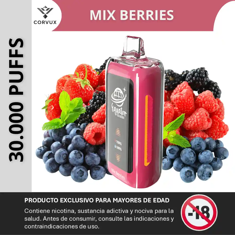 PROHIBIDA LA VENTA A MENORES DE EDAD. PRODUCTO EXCLUSIVO PARA MAYORES DE EDAD, CONTIENE NICOTINA, SUSTANCIA ADICTIVA Y NOCIVA PARA LA SALUD. ANTES DE CONSUMIR, CONSULTE LAS INDICACIONES Y CONTRAINDICACIONES DE USO. El Equator EQ30000 es un dispositivo desechable recargable de alta capacidad que ofrece hasta 30 000 caladas con batería integrada de 900 mAh, tres tanques de e-líquido y sistema de bobinas de triple malla. Incluye pantalla animada para visualizar niveles de batería y líquido, flujo de aire ajustable y carga rápida USB-C, pensado para uso prolongado sin mantenimiento frecuente ✨ Perfil del sabor ✦ Notas principales: Mezcla de frutos rojos como moras, frambuesas y arándanos con un matiz afrutado bien definido. ✦ Contrastes: El equilibrio entre dulzor y acidez ligera de los frutos aporta un contraste natural y fresco al perfil general. ✦ Experiencia sensorial: Perfil frutal vibrante con sensación limpia y bien integrada, con notas de bayas que se mantienen constantes a lo largo de las caladas. ✦ Ideal para: Usuarios que prefieren combinaciones de frutos rojos complejas con matices equilibrados y un dispositivo de larga duración. 📋 Especificaciones técnicas ✦ Capacidad de e-líquido: 30 mL precargado (10 mL x 3 tanques). ✦ Inhalaciones estimadas: Hasta 30 000 puffs. ✦ Batería: 900 mAh recargable con USB-C. ✦ Sistema de calefacción: Triple malla para producción uniforme. ✦ Pantalla: Animada para indicar niveles de batería y e-líquido. ✦ Ajustes de aire: Flujo de aire ajustable para personalizar la sensación de calada. ✦ Concentración: Sal de nicotina al 5 % (50 mg). PROHIBIDA LA VENTA A MENORES DE EDAD. PRODUCTO EXCLUSIVO PARA MAYORES DE EDAD, CONTIENE NICOTINA, SUSTANCIA ADICTIVA Y NOCIVA PARA LA SALUD. ANTES DE CONSUMIR, CONSULTE LAS INDICACIONES Y CONTRAINDICACIONES DE USO.
