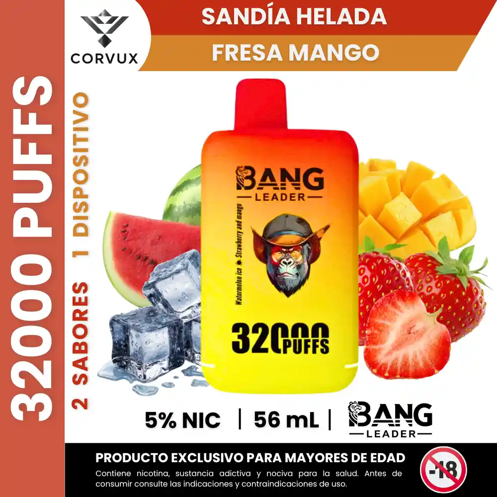 Vaper Vaporizador 32000 Puffs Vape Bang Leader - Doble Sabor | 5% Nicotina | - Watermelon Ice [ Sandía Helada ] + Strawberry Mango [ Fresa Y Mango ]