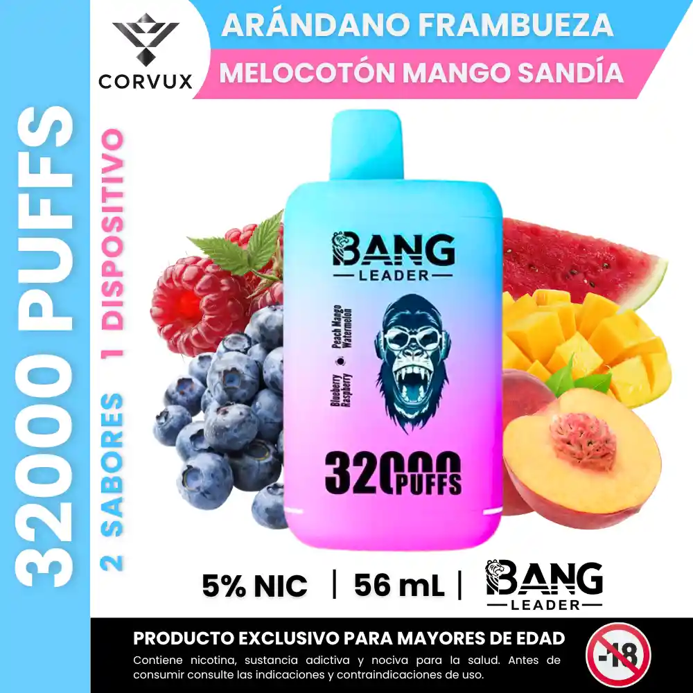 PROHIBIDA LA VENTA A MENORES DE EDAD. PRODUCTO EXCLUSIVO PARA MAYORES DE EDAD, CONTIENE NICOTINA, SUSTANCIA ADICTIVA Y NOCIVA PARA LA SALUD. ANTES DE CONSUMIR, CONSULTE LAS INDICACIONES Y CONTRAINDICACIONES DE USO. Bang Leader 32000 Bocanadas – Sistema Dual Flavor Dispositivo desechable de alta capacidad que integra dos combinaciones de sabor en un mismo dispositivo, permitiendo alternar entre perfiles frutales distintos. Su tecnología Dual Mesh favorece una vaporización uniforme y una liberación de aroma más consistente durante su uso. ✨ Perfil de Sabor • Notas principales: Pod 1. Arándano frambuesa. Pod 2. Melocotón Mango Sandía • Contrastes: Pod 1. Arándanos y frambuesas: mezcla de frutos rojos con equilibrio entre dulzor y ligera acidez. Pod 2. Melocotón, mango y sandía: perfil tropical jugoso con matices suaves y refrescantes. • Experiencia sensorial: El sistema Dual Flavor permite cambiar entre dos perfiles de sabor dentro del mismo dispositivo, alternando entre una mezcla de frutos rojos vibrante y un conjunto tropical más dulce. La tecnología Dual Mesh Coil contribuye a una producción de vapor estable y a una percepción más definida del sabor. • Ideal para: Usuarios que buscan variedad de sabores en un solo dispositivo y prefieren combinaciones frutales que alternen entre notas dulces y ligeramente ácidas. 📋 Especificaciones Técnicas: • Hasta 32.000 inhalaciones • Nicotine: 5 % • Sistema Dual Mesh (doble bobina) • Dispositivo desechable • Batería: 650 mAh • Rotación de sabores integrada • Ingredientes base: glicerina vegetal, propilenglicol, saborizantes naturales y artificiales, nicotina PROHIBIDA LA VENTA A MENORES DE EDAD. PRODUCTO EXCLUSIVO PARA MAYORES DE EDAD, CONTIENE NICOTINA, SUSTANCIA ADICTIVA Y NOCIVA PARA LA SALUD. ANTES DE CONSUMIR, CONSULTE LAS INDICACIONES Y CONTRAINDICACIONES DE USO.