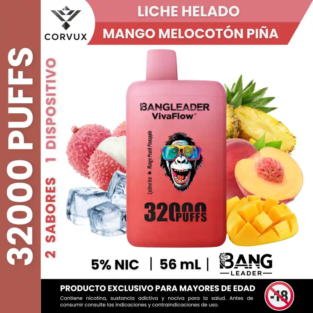 PROHIBIDA LA VENTA A MENORES DE EDAD. PRODUCTO EXCLUSIVO PARA MAYORES DE EDAD, CONTIENE NICOTINA, SUSTANCIA ADICTIVA Y NOCIVA PARA LA SALUD. ANTES DE CONSUMIR, CONSULTE LAS INDICACIONES Y CONTRAINDICACIONES DE USO. Bang Leader 32000 Bocanadas – Sistema Dual Flavor Dispositivo desechable de alta capacidad con sistema dual flavor, que permite alternar entre dos perfiles de sabor en un mismo equipo. Combina un perfil frutal fresco de liche con efecto frío y una mezcla tropical de mango, melocotón y piña, ofreciendo dos experiencias distintas dentro del mismo dispositivo. ✨ Perfil de Sabor • Notas principales: Pod 1. Liche Helado: dulzor suave y floral del liche con sensación refrescante. Pod 2. Mango Melocotón Piña: mezcla tropical dulce con matices jugosos y ligeramente ácidos. • Contrastes: El liche frío aporta una sensación ligera y refrescante. La combinación mango–melocotón–piña ofrece un perfil más dulce y tropical, con mayor intensidad frutal. • Experiencia sensorial: Perfil equilibrado entre frutas dulces y notas refrescantes, con transición sencilla entre ambos sabores gracias al sistema de doble selección del dispositivo. • Ideal para: Personas que prefieren variar el sabor sin cambiar de dispositivo. Usuarios que disfrutan perfiles frutales frescos y tropicales. Uso prolongado gracias a su alta capacidad de puffs. 📋 Especificaciones Técnicas: • Hasta 32.000 inhalaciones • Nicotine: 5 % • Sistema Dual Mesh (doble bobina) • Dispositivo desechable • Batería: 650 mAh • Rotación de sabores integrada • Ingredientes base: glicerina vegetal, propilenglicol, saborizantes naturales y artificiales, nicotina PROHIBIDA LA VENTA A MENORES DE EDAD. PRODUCTO EXCLUSIVO PARA MAYORES DE EDAD, CONTIENE NICOTINA, SUSTANCIA ADICTIVA Y NOCIVA PARA LA SALUD. ANTES DE CONSUMIR, CONSULTE LAS INDICACIONES Y CONTRAINDICACIONES DE USO.