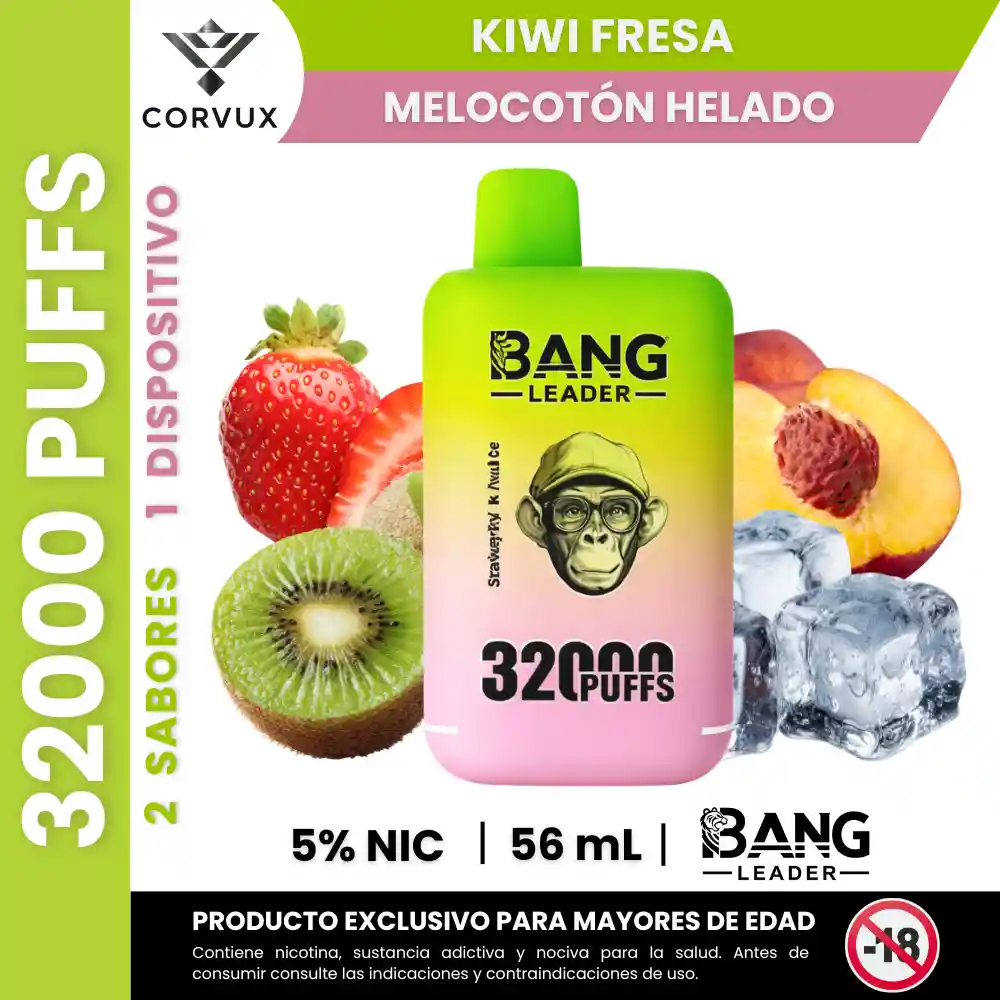 PROHIBIDA LA VENTA A MENORES DE EDAD. PRODUCTO EXCLUSIVO PARA MAYORES DE EDAD, CONTIENE NICOTINA, SUSTANCIA ADICTIVA Y NOCIVA PARA LA SALUD. ANTES DE CONSUMIR, CONSULTE LAS INDICACIONES Y CONTRAINDICACIONES DE USO. Bang Leader 32000 Bocanadas – Sistema Dual Flavor El BANG Leader 32000 Puffs integra dos perfiles de sabor en un solo dispositivo, permitiendo alternar entre una mezcla frutal equilibrada de kiwi y fresa, o un perfil suave de melocotón acompañado de una sensación refrescante. Diseñado para quienes prefieren variedad en la experiencia sin cambiar de dispositivo. ✨ Perfil de Sabor • Notas principales: Pod 1. Kiwi Fresa: combinación frutal donde la acidez ligera del kiwi se mezcla con la dulzura suave de la fresa. Pod 2. Melocotón Helado: melocotón maduro con un fondo refrescante que aporta sensación fría al final. • Contrastes: Balance entre acidez tropical y dulzor de frutos rojos en el primer perfil. Dulzor suave del melocotón contrastado con una nota fresca en el segundo. • Experiencia sensorial: Perfil aromático frutal con transiciones suaves. El primer sabor ofrece un carácter vibrante y ligeramente ácido, mientras el segundo entrega una sensación más redonda y refrescante. • Ideal para: Usuarios que prefieren alternar entre un perfil frutal intenso y otro más suave y refrescante durante el día. 📋 Especificaciones Técnicas: • Hasta 32.000 inhalaciones • Nicotine: 5 % • Sistema Dual Mesh (doble bobina) • Dispositivo desechable • Batería: 650 mAh • Rotación de sabores integrada • Ingredientes base: glicerina vegetal, propilenglicol, saborizantes naturales y artificiales, nicotina PROHIBIDA LA VENTA A MENORES DE EDAD. PRODUCTO EXCLUSIVO PARA MAYORES DE EDAD, CONTIENE NICOTINA, SUSTANCIA ADICTIVA Y NOCIVA PARA LA SALUD. ANTES DE CONSUMIR, CONSULTE LAS INDICACIONES Y CONTRAINDICACIONES DE USO.
