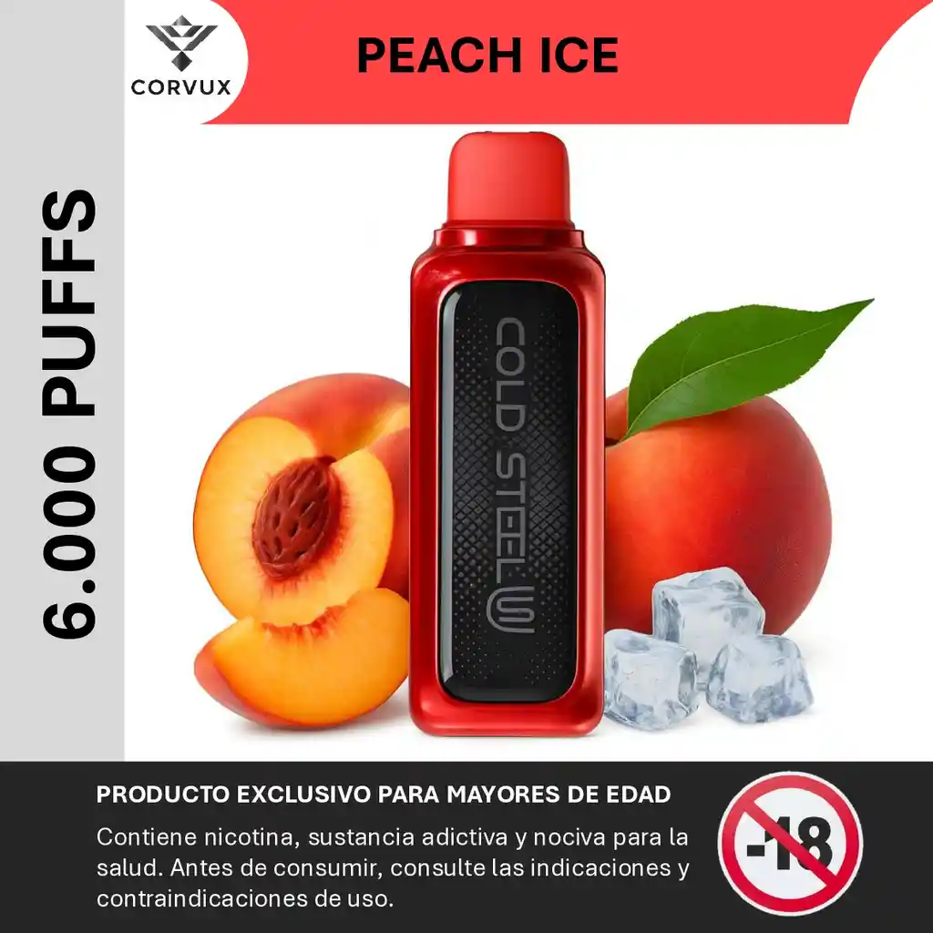 PROHIBIDA LA VENTA A MENORES DE EDAD. PRODUCTO EXCLUSIVO PARA MAYORES DE EDAD, CONTIENE NICOTINA, SUSTANCIA ADICTIVA Y NOCIVA PARA LA SALUD. ANTES DE CONSUMIR, CONSULTE LAS INDICACIONES Y CONTRAINDICACIONES DE USO. Vape Cold Steel - Peach Ice - Concentración de nicotina: 5% (50 mg) - Batería: 500mAh - Bobina de malla: bobina de malla EMCT 2.0 avanzada - Número de bocanadas: 6.000 bocanadas - Puerto de carga tipo C