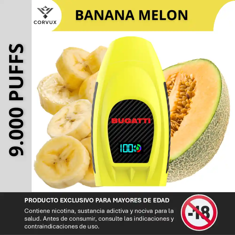 PROHIBIDA LA VENTA A MENORES DE EDAD. PRODUCTO EXCLUSIVO PARA MAYORES DE EDAD, CONTIENE NICOTINA, SUSTANCIA ADICTIVA Y NOCIVA PARA LA SALUD. ANTES DE CONSUMIR, CONSULTE LAS INDICACIONES Y CONTRAINDICACIONES DE USO. BUGATTI 9000 PUFFS – Banana Melon es un vape desechable recargable con aproximadamente 9 000 caladas, diseñado para uso prolongado con un sistema sencillo y tecnología moderna. El dispositivo incluye batería interna recargable tipo USB-C, pantalla LED integrada para visualizar niveles de batería y e-líquido, y está prellenado con e-líquido con concentración de nicotina en sales. ✦ Notas principales: Perfil que combina banana madura y dulce con melón jugoso y fresco, ofreciendo una sensación frutal visible desde la primera calada. (Interpretación de la mezcla Banana Melon en desechables similares). ✦ Contrastes: La dulzura natural de la banana se equilibra con la ligera frescura del melón, generando un perfil frutal equilibrado sin dominancias intensas. ✦ Experiencia sensorial: Sensación suave y redonda en el paladar, con un perfil frutal dulzón que mantiene la presencia de ambos ingredientes de forma consistente. ✦ Ideal para: Quienes prefieren sabores frutales clásicos y suaves, con un balance entre dulzor y frescura sin notas complejas. ⚙️ Especificaciones técnicas: ✦ Caladas estimadas: ~9000 puffs. ✦ E-líquido prellenado: ~15 ml. ✦ Batería: Recargable USB-C (~600–650 mAh). ✦ Nicotine strength: 5 %. ✦ Pantalla: LED integrada para batería y e-líquido. ✦ Activación: Por inhalación (draw-activated). PROHIBIDA LA VENTA A MENORES DE EDAD. PRODUCTO EXCLUSIVO PARA MAYORES DE EDAD, CONTIENE NICOTINA, SUSTANCIA ADICTIVA Y NOCIVA PARA LA SALUD. ANTES DE CONSUMIR, CONSULTE LAS INDICACIONES Y CONTRAINDICACIONES DE USO.