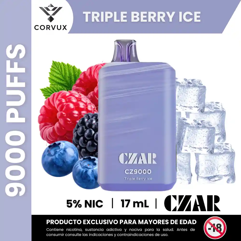 PROHIBIDA LA VENTA A MENORES DE EDAD. PRODUCTO EXCLUSIVO PARA MAYORES DE EDAD, CONTIENE NICOTINA, SUSTANCIA ADICTIVA Y NOCIVA PARA LA SALUD. ANTES DE CONSUMIR, CONSULTE LAS INDICACIONES Y CONTRAINDICACIONES DE USO. El Vape Czar 9000 PUFFS Triple Berry Ice es un dispositivo de vapeo desechable diseñado para ofrecer una experiencia de uso prolongada con hasta 9000 inhalaciones en un formato compacto y sin mantenimiento. ✨ Perfil del sabor ✦ Notas Principales: Mezcla de sabores de frutos rojos como arándano, frambuesa y mora, integrados en un perfil frutal. ✦ Contrastes: La dulzura natural de las bayas se ve equilibrada por una sensación fresca mentolada en el exhalo ✦ Experiencia Sensorial: Inhalación suave con un perfil frutal vibrante seguida de una salida fresca y refrescante. ✦ Ideal para: Usuarios adultos que buscan un dispositivo de vapeo fácil de usar con un sabor frutal y un acabado fresco, con larga duración sin recargas ni ajustes. 📋 Especificaciones técnicas ✦ Puffs estimados: Hasta 9000. ✦ E-líquido: 17 mL prellenados. ✦ Nicotine: ~5 % (50 mg) de nicotina. ✦ Batería: Integrada 600 mAh recargable por USB-C. ✦ Tecnología de calentamiento: Bobina de malla para sabor uniforme. ✦ Activación: Por inhalación, sin botones. ✦ Características adicionales: Control de flujo de aire ajustable, pantalla para monitorear batería y e-líquido. PROHIBIDA LA VENTA A MENORES DE EDAD. PRODUCTO EXCLUSIVO PARA MAYORES DE EDAD, CONTIENE NICOTINA, SUSTANCIA ADICTIVA Y NOCIVA PARA LA SALUD. ANTES DE CONSUMIR, CONSULTE LAS INDICACIONES Y CONTRAINDICACIONES DE USO.