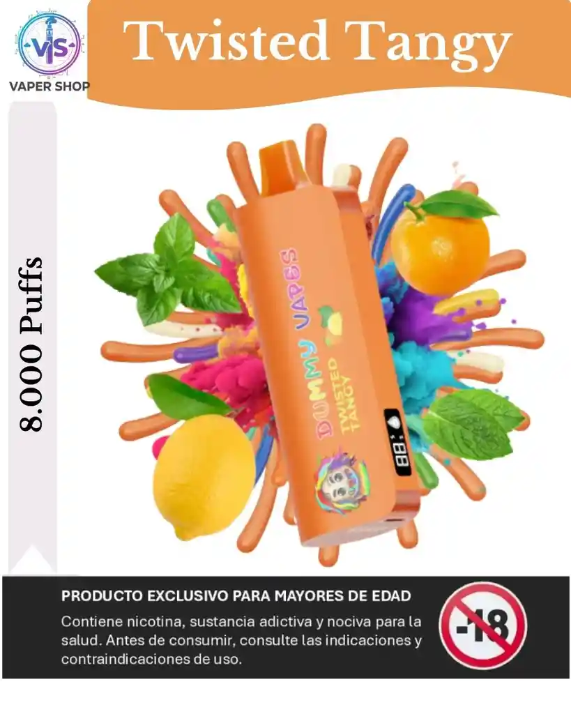 Este es otro modelo de la línea Dummy Vapes, que mantiene la misma tecnología avanzada que el anterior pero con un perfil de sabor completamente distinto, enfocado en lo cítrico y vibrante. Aquí tienes los detalles de este modelo Twisted Tangy: 🍋 Perfil de Sabor: Twisted Tangy Sabor: Es una mezcla compleja de cítricos. Predominan notas de limón y mandarina (como se ve en la imagen), con un toque de naranja. Sensación: A diferencia del "Black Ice", este sabor es más ácido y refrescante por la fruta, ideal para quienes prefieren sabores "eléctricos" y chispeantes que no sean excesivamente dulces. Tiene un ligero toque de frescura, pero el protagonismo es la acidez frutal. 🛠️ Características del Dispositivo Capacidad: Mantiene los 8.000 Puffs, lo que garantiza una larga duración (dependiendo del uso, puede durar entre 2 y 3 semanas). Tecnología Quaq Neo Mesh Coil: Estos dispositivos suelen usar una resistencia de malla que hace que el sabor sea constante desde la primera hasta la última calada, evitando el sabor a quemado cuando queda poco líquido. Pantalla Inteligente: Al igual que el modelo anterior, incluye el panel LED para monitorear: Batería (%) Nivel de Líquido