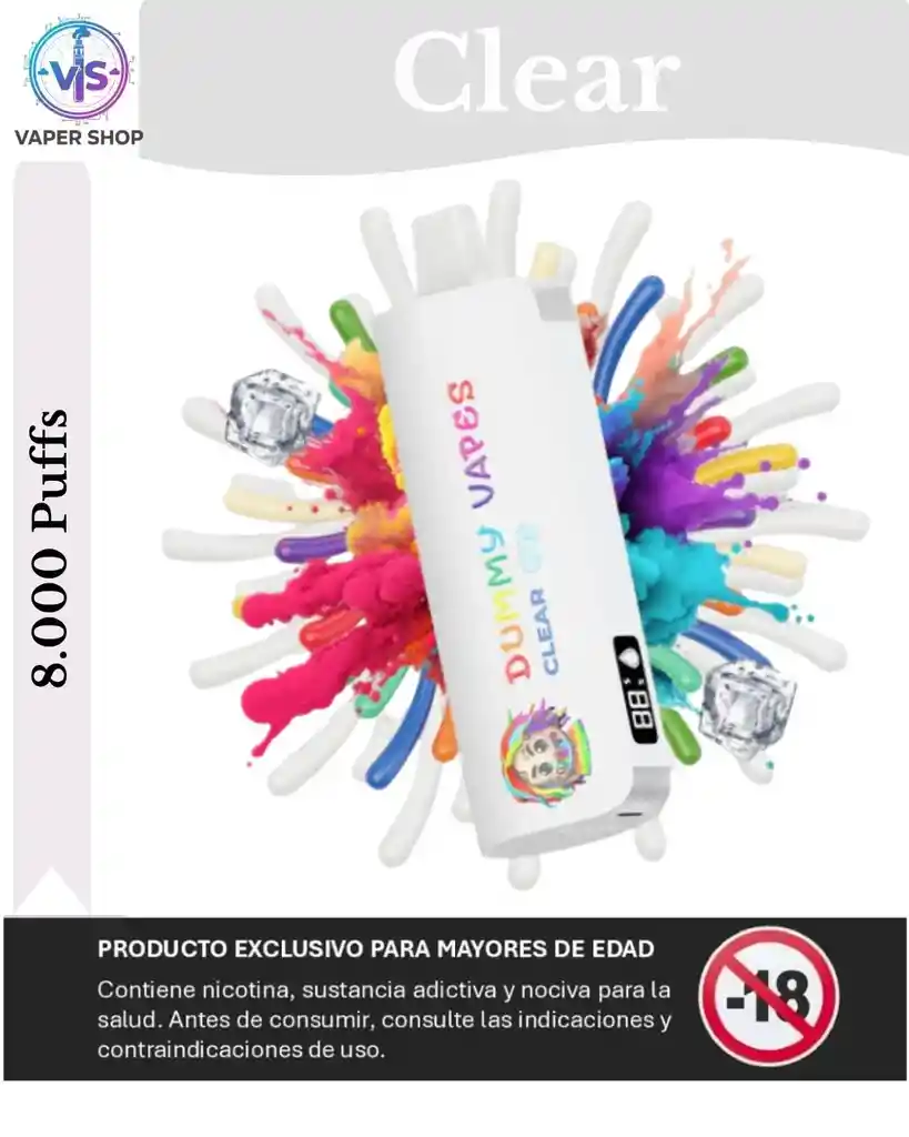 Este es el Dummy Vapes Clear, y es el modelo más "minimalista" de toda la línea. A diferencia de los anteriores que explotaban en sabores frutales o dulces, este tiene un propósito muy específico. Aquí te explico de qué se trata: ❄️ ¿A qué sabe el "Clear"? Sabor Neutro: El sabor Clear está diseñado para ser insípido o con un toque muy ligero de mentol. No tiene frutas, ni caramelos, ni sabores dulces intensos. La Sensación: Lo que sientes es principalmente un golpe de garganta limpio y una exhalación refrescante. ¿Para quién es?: Para personas que se cansan de los sabores muy dulces o "empalagosos". Para quienes prefieren la discreción (el olor del vapor es casi imperceptible). Para ex-fumadores que buscan una experiencia más parecida a la neutralidad, sin sabores artificiales de frutas. 🛠️ Características del Dispositivo Rendimiento: Mantiene los estándar de la marca con 8.000 Puffs. Pantalla Digital: Al igual que el Black Ice o el Twisted Tangy, te permite ver con precisión: Batería %: Para que sepas exactamente cuándo cargarlo. Líquido %: Vital para saber cuánto te queda de esa experiencia "limpia". Diseño: El cuerpo del dispositivo es blanco puro, lo que refuerza visualmente la idea de un sabor limpio y sin añadidos.