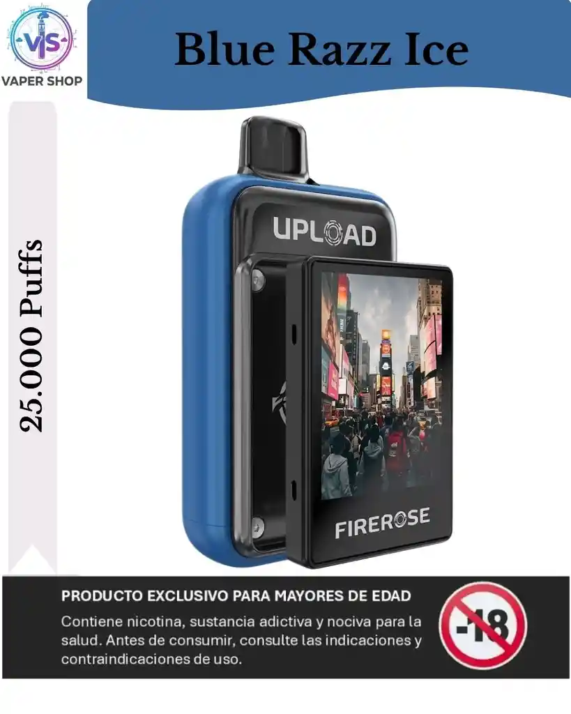 El Firerose Upload 25K es un dispositivo de vapeo desechable de alta capacidad, conocido por incluir una pantalla intercambiable y personalizable. es una de las opciones disponibles para este modelo y se caracteriza por una mezcla de frambuesa azul dulce con un toque refrescante (efecto "ice" o hielo). Aquí tienes los detalles principales sobre este dispositivo: Capacidad y Puffs: Ofrece hasta 25,000 inhalaciones (puffs) gracias a su diseño de larga duración. Características Técnicas: Pantalla: Cuenta con una pantalla que se puede extraer o personalizar. Batería: Recargable mediante puerto USB-C (capacidad de 660mAh). Bobinas: Utiliza sistema de bobina de malla doble (dual mesh coils) para mejorar la producción de sabor y vapor. Ajustes: Permite regular tanto el flujo de aire como el modo de potencia. Uso: Es un dispositivo activado por calada (draw-activated), por lo que no requiere botones para funcionar. Nota importante: Los dispositivos de vapeo contienen nicotina, que es una sustancia altamente adictiva. Este producto está destinado exclusivamente a adultos fumadores o usuarios de nicotina y no debe ser utilizado por menores de edad ni por personas no fumadoras.