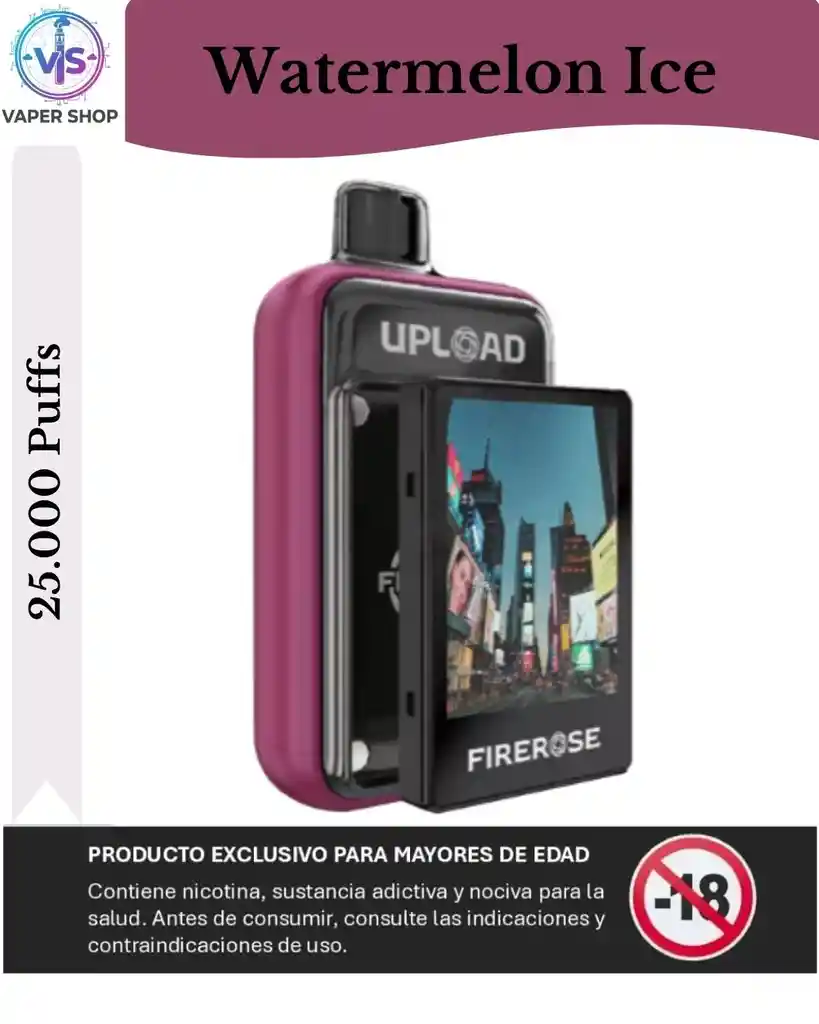 El Firerose Upload 25K es un dispositivo de vapeo desechable de alta capacidad, conocido por incluir una pantalla intercambiable y personalizable. es una de las opciones disponibles para este modelo y se caracteriza por una mezcla de frambuesa azul dulce con un toque refrescante (efecto "ice" o hielo). Aquí tienes los detalles principales sobre este dispositivo: Capacidad y Puffs: Ofrece hasta 25,000 inhalaciones (puffs) gracias a su diseño de larga duración. Características Técnicas: Pantalla: Cuenta con una pantalla que se puede extraer o personalizar. Batería: Recargable mediante puerto USB-C (capacidad de 660mAh). Bobinas: Utiliza sistema de bobina de malla doble (dual mesh coils) para mejorar la producción de sabor y vapor. Ajustes: Permite regular tanto el flujo de aire como el modo de potencia. Uso: Es un dispositivo activado por calada (draw-activated), por lo que no requiere botones para funcionar. Nota importante: Los dispositivos de vapeo contienen nicotina, que es una sustancia altamente adictiva. Este producto está destinado exclusivamente a adultos fumadores o usuarios de nicotina y no debe ser utilizado por menores de edad ni por personas no fumadoras.