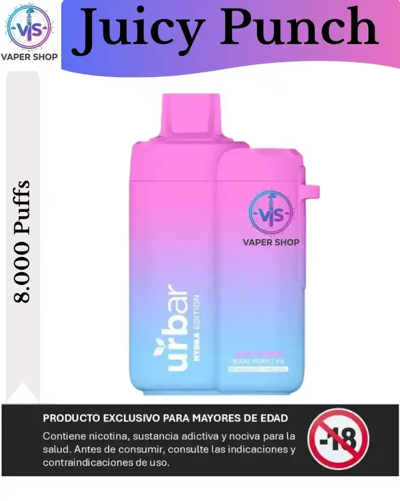 Características del Dispositivo (Urbar Hydra Edition) Basado en las especificaciones de la serie Urbar Hydra, este vaporizador destaca por su alta capacidad y durabilidad: Capacidad de caladas: Generalmente ofrece hasta 8,000 puffs (caladas). Existe también una versión más potente de 15,000 puffs. Batería: Cuenta con una batería interna de 650mAh (en el modelo de 8,000 puffs) que es recargable mediante un puerto USB tipo C. Tecnología: Utiliza una bobina de malla (Mesh Coil) diseñada para mantener la intensidad del sabor desde la primera hasta la última calada. Contenido de nicotina: Suele presentarse con una concentración del 5% (50mg) de sales de nicotina.