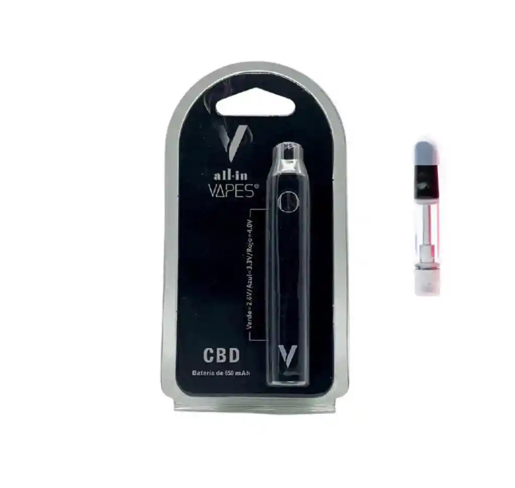 QUE TE INCLUIMOS: 1 VAPE PEN O LAPIZ MARCA CBD ALL IN VAPES COLOR NEGRO 1 CARTUCHO LIMPIO SIN ACEITES PARA RECARGAR Qué ofrece la batería “All In Vapes CBD 650 mAh”? • Esta batería está diseñada para cartuchos universales con rosca 510, es decir, es compatible con la mayoría de los cartuchos estándar  . • Especificaciones técnicas: • Capacidad: 650 mAh. • Tres niveles de potencia indicados por colores: • Verde = ~3.4 V (baja) • Azul = ~3.7 V (media) • Rojo = ~4.0 V (alta) • Modo de precalentamiento activado con doble clic de botón  .