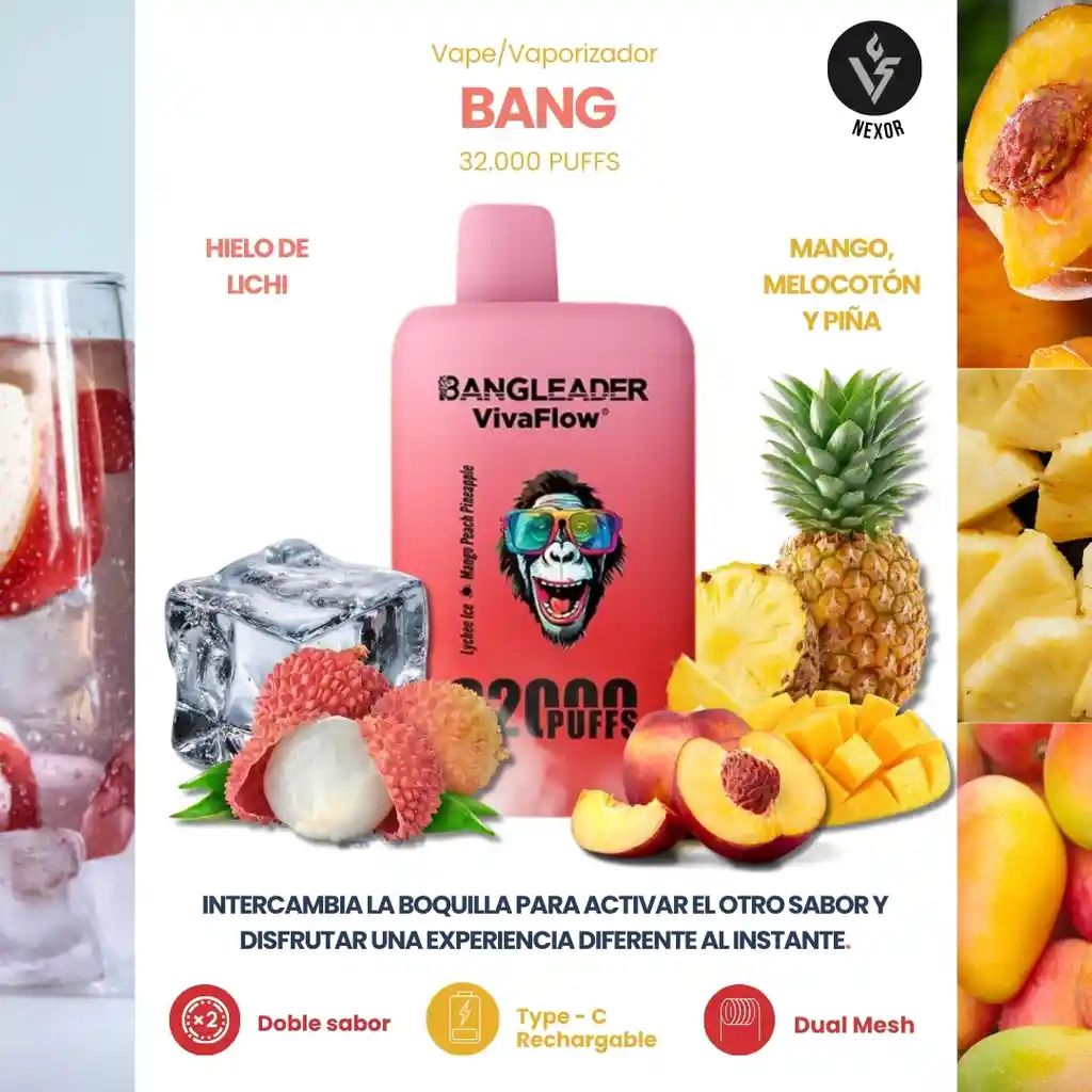 🧊🥭 Hielo de Lichi (Sabor 1) Sabor exótico y ligeramente dulce del lichi con un toque frío mentolado que deja una sensación fresca y delicada en cada calada. 🥭🍑🍍 Mango Melocotón Piña (Sabor 2) Explosión tropical intensa donde el mango dulce se mezcla con la suavidad del melocotón y el toque jugoso de la piña para un perfil frutal vibrante. Intercambia la boquilla y cambia de sabor en segundos. 🔥 Características: Hasta 32.000 puffs Doble sabor intercambiable Boquilla movible Batería recargable Vapor denso y suave Diseño moderno y ergonómico