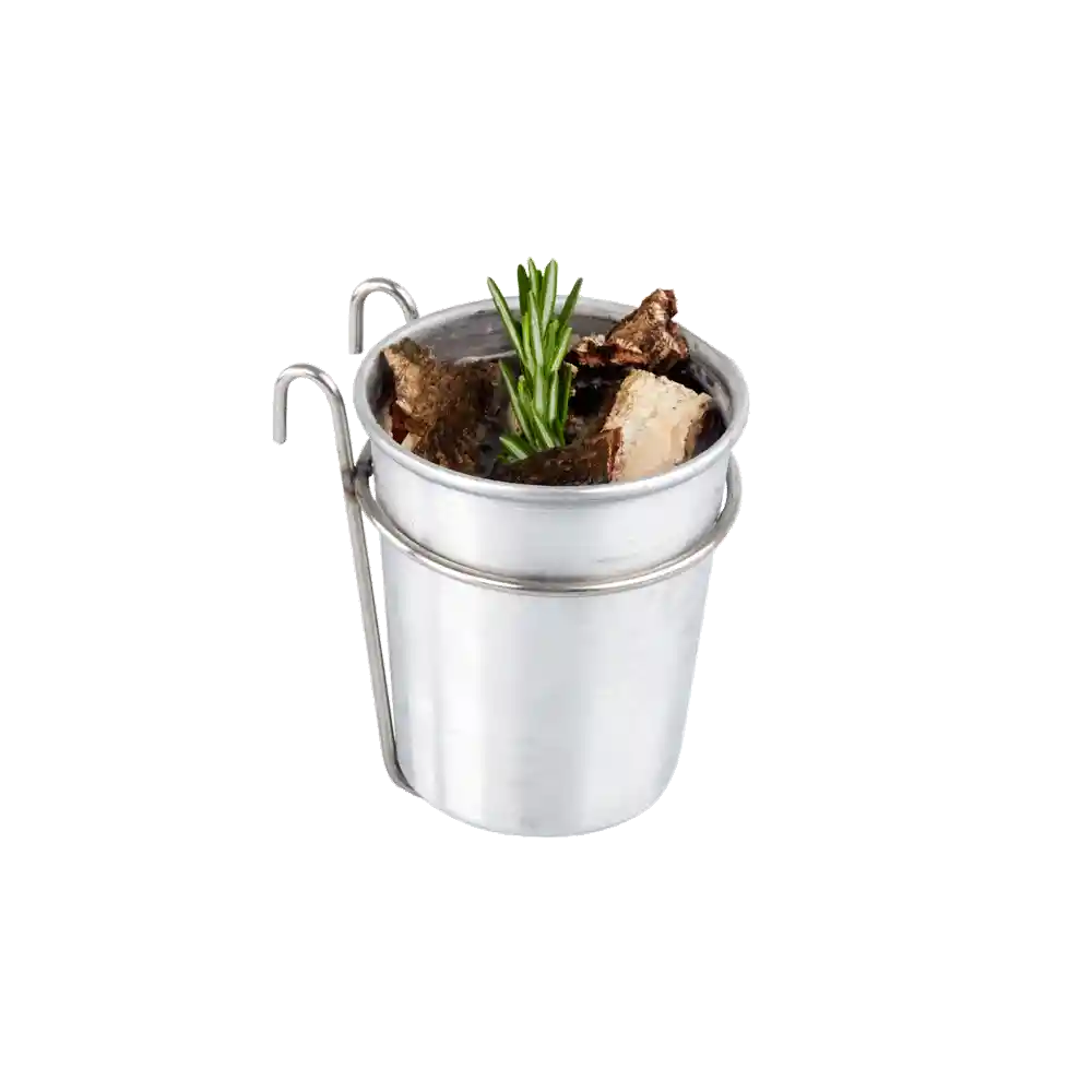 Accesorio que consiste en un vaso metálico y un soporte en donde van las astillas con algún líquido (agua, cerveza o vino) para generar humedad en el ahumador, evitando que algunos cortes de carne pierdan sus jugos, además aromatiza el asado. Las astillas también las manejamos y son de árboles como el naranjo, el cerezo silvestre. Material: Acero inoxidable Medidas: 11 cm de alto X 8 cm de ancho, 10 cm de profundidad. Capacidad: 200 ml