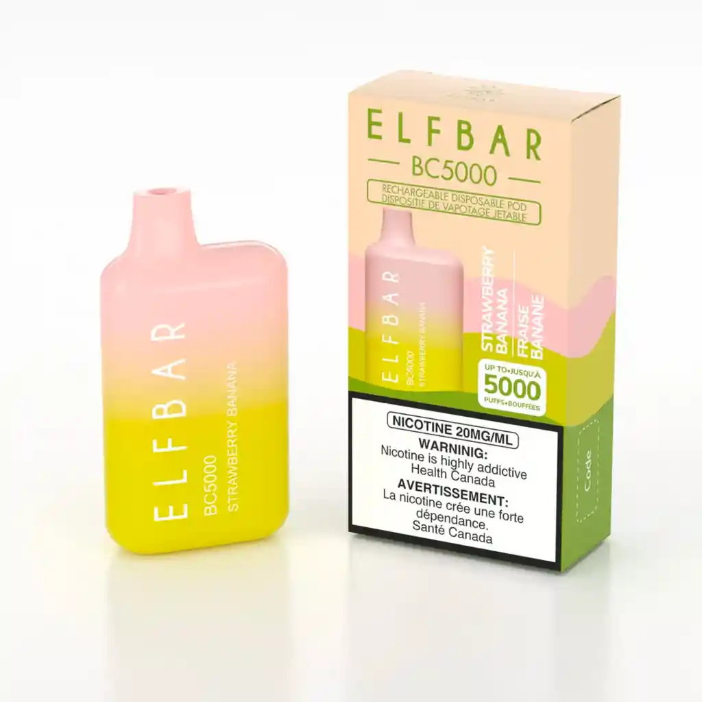 Vaporizador elf bar fresa banano 5000 puffs recargable. Este producto contiene nicotina, la nicotina es adictiva, solo para mayores de edad.