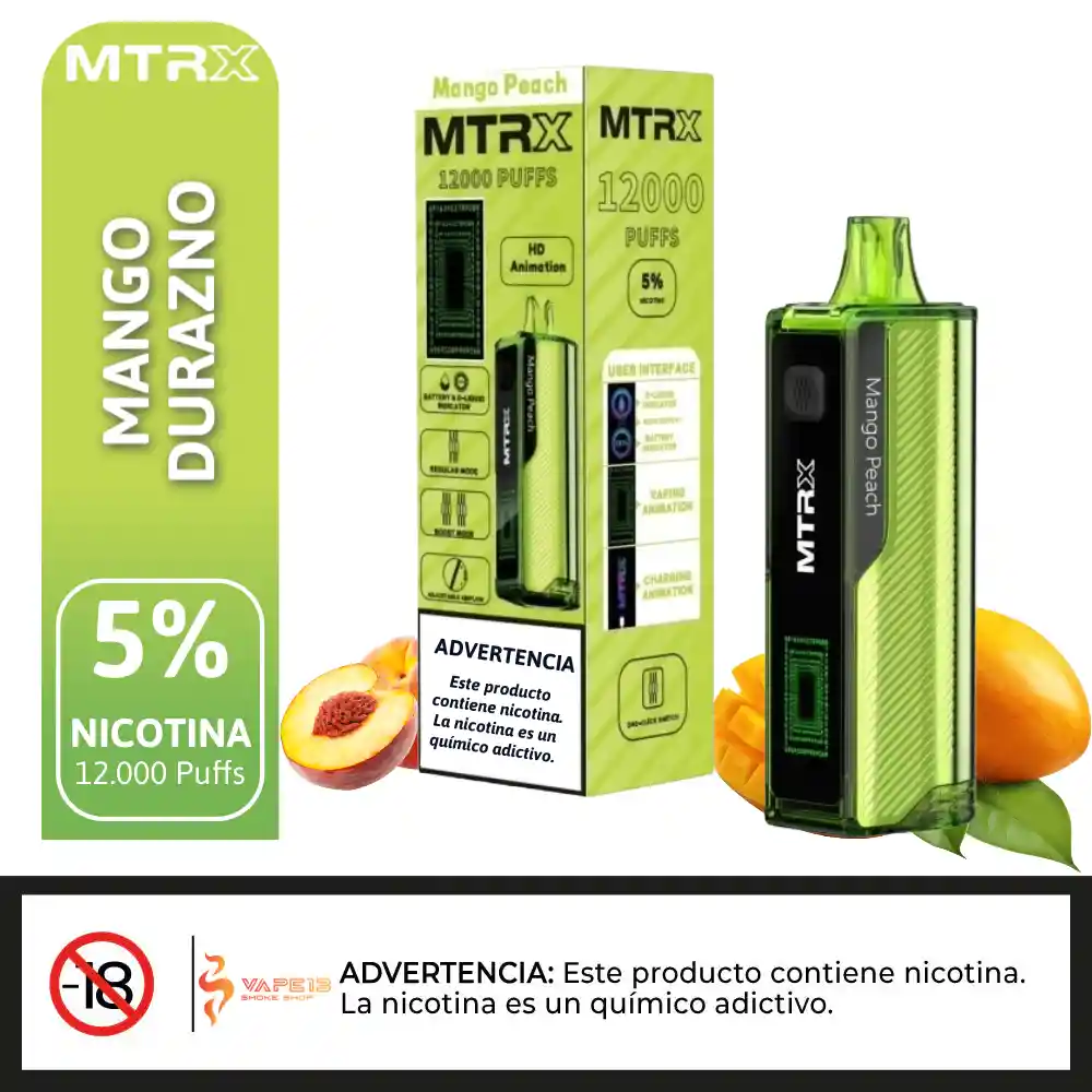 El MTRX 12000 - MANGO PEACH - es un dispositivo de v-a-p-e-o desechable de alto rendimiento, diseñado para brindar hasta 12 000 usos aproximadamente en un formato cómodo y fácil de usar. Pertenece a la familia MTRX 12K, que integra funciones modernas como pantalla digital con indicadores, modos ajustables y flujo de aire personalizable para una experiencia prolongada. ✨ 📋 Especificaciones técnicas ✦ Capacidad de caladas: Hasta 12 000 puffs con una sola carga. ✦ E-líquido precargado: ~15 ml. ✦ Concentración de n-i-c-o-t-i-n-a: 5 % (50 mg). ✦ Batería: ~650 mAh recargable mediante puerto USB-C. ✦ Pantalla: HD con indicadores de batería, nivel de e-líquido y modo. ✦ Modos: Regular y Boost para variar intensidad. ✦ Flujo de aire: Ajustable para personalizar la resistencia de la calada. PROHIBIDA LA VENTA A MENORES DE EDAD. PRODUCTO EXCLUSIVO PARA MAYORES DE EDAD, CONTIENE NICOTINA, SUSTANCIA ADICTIVA Y NOCIVA PARA LA SALUD. ANTES DE CONSUMIR, CONSULTE LAS INDICACIONES Y CONTRAINDICACIONES DE USO.