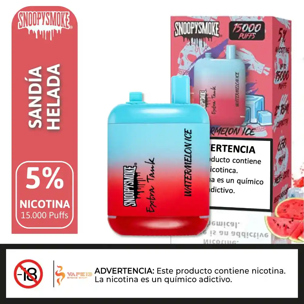 Echa un vistazo al Snoopy Smoke - WATERMELON ICE - Extra Tank 2 Desechable, que ofrece 18mL x 2 de capacidad precargada, 5% de potencia de n-i-c-@-t--i-n-a, y ofrece hasta 15000 usos. Sn@opy-Sm@ke Extra Tank 2 15000 Desechable Características: – Capacidad precargada: 18mL x 2 – Capacidad de la batería: 650mAh – Max Usos: 15000 – Potencia de nicotina: 5% (50mg) – Funcionamiento: Activado por tiro – Elemento calefactor: Bobina de malla – Carga: Puerto Tipo-C.