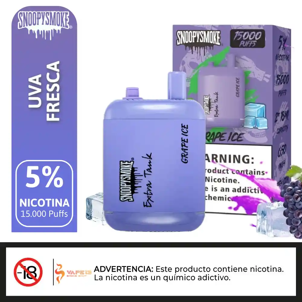 Echa un vistazo al Snoopy Smoke - GRAPE ICE - Extra Tank 2 Desechable, que ofrece 18mL x 2 de capacidad precargada, 5% de potencia de n-i-c-@-t--i-n-a, y ofrece hasta 15000 usos. Sn@opy-Sm@ke Extra Tank 2 15000 Desechable Características: – Capacidad precargada: 18mL x 2 – Capacidad de la batería: 650mAh – Max Usos: 15000 – Potencia de nicotina: 5% (50mg) – Funcionamiento: Activado por tiro – Elemento calefactor: Bobina de malla – Carga: Puerto Tipo-C.