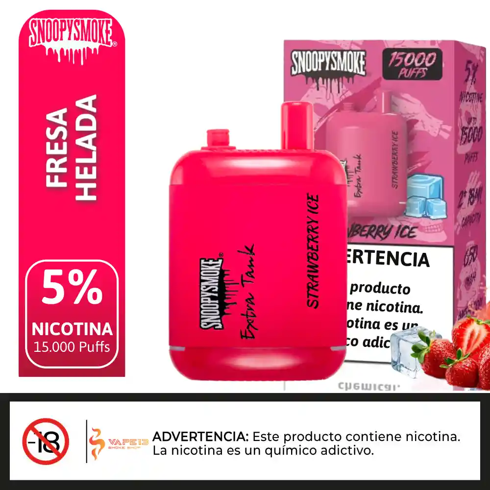 Echa un vistazo al Snoopy Smoke - STRAWBERRY ICE - Extra Tank 2 Desechable, que ofrece 18mL x 2 de capacidad precargada, 5% de potencia de n-i-c-@-t--i-n-a, y ofrece hasta 15000 usos. Sn@opy-Sm@ke Extra Tank 2 15000 Desechable Características: – Capacidad precargada: 18mL x 2 – Capacidad de la batería: 650mAh – Max Usos: 15000 – Potencia de nicotina: 5% (50mg) – Funcionamiento: Activado por tiro – Elemento calefactor: Bobina de malla – Carga: Puerto Tipo-C.