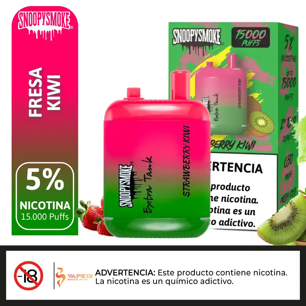 Echa un vistazo al Snoopy Smoke - STRAWBERRY KIWI - Extra Tank 2 Desechable, que ofrece 18mL x 2 de capacidad precargada, 5% de potencia de n-i-c-@-t--i-n-a, y ofrece hasta 15000 usos. Sn@opy-Sm@ke Extra Tank 2 15000 Desechable Características: – Capacidad precargada: 18mL x 2 – Capacidad de la batería: 650mAh – Max Usos: 15000 – Potencia de nicotina: 5% (50mg) – Funcionamiento: Activado por tiro – Elemento calefactor: Bobina de malla – Carga: Puerto Tipo-C.