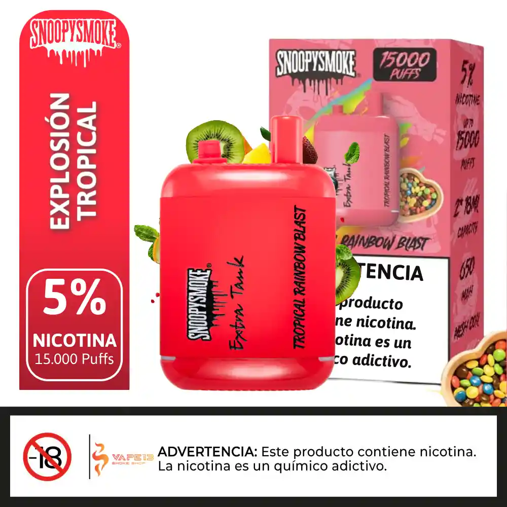 Echa un vistazo al Snoopy Smoke - TROPICAL RAINBOW BLAST - Extra Tank 2 Desechable, que ofrece 18mL x 2 de capacidad precargada, 5% de potencia de n-i-c-@-t--i-n-a, y ofrece hasta 15000 usos. Sn@opy-Sm@ke Extra Tank 2 15000 Desechable Características: – Capacidad precargada: 18mL x 2 – Capacidad de la batería: 650mAh – Max Usos: 15000 – Potencia de nicotina: 5% (50mg) – Funcionamiento: Activado por tiro – Elemento calefactor: Bobina de malla – Carga: Puerto Tipo-C.