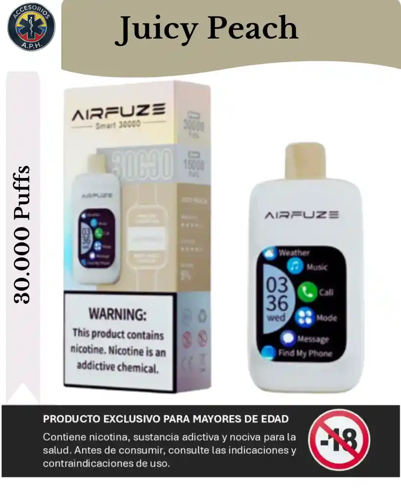 Experimenta el futuro del vapeo con el vapeador AIRFUZE Smart 30K Puff desechable Presentamos el AIRFUZE Smart 30K Puff Disposable Vape: el dispositivo pionero de vapeo inteligente que combina tecnología avanzada y una comodidad excepcional. Este dispositivo innovador ofrece una impresionante capacidad de 30.000 caladas e integra conectividad para smartphones, reproducción de música y funciones similares a relojes inteligentes, estableciendo un nuevo estándar en el mundo del vapeo. Pantalla táctil TFT de 2": Una pantalla táctil TFT de 2" vibrante y sensible permite un control intuitivo y una navegación fluida de todas las funciones inteligentes. Integración de smartphones y música: Realizar y recibir llamadas: Gestiona las llamadas directamente a través de tu dispositivo de vapeo para máxima comodidad. Música de reproducción: Disfruta de sonido de alta calidad mientras te llevas. Compartir fotos: Comparte fácilmente tus momentos favoritos. Encuentra mi teléfono: No vuelvas a perder tu teléfono con esta práctica función. Tres modos de vapeo: Suave: Para una sesión de vapeo suave y sin problemas. Normal: Un modo equilibrado para uso diario. Impulso: Para un golpe intenso y potente. Funciones: Líquido para e-líquido de 20 ml prellenado: Disfrute duradero sin necesidad de recargas. Batería recargable: Garantiza que tu dispositivo esté siempre listo cuando tú lo estés. Número de inhalaciones: Aproximadamente 30.000 bolsillos. Pantalla táctil inteligente: Navegación sencilla y control de tu experiencia de vapeo. Conexión inalámbrica a tu teléfono móvil: Mantente conectado y entretenido. Ajuste de salida de 3 niveles: Adapta tu experiencia de vapeo con los modos Soft, Normal y Boost. 5% (50mg) de concentración en nicotina: Para una experiencia satisfactoria y completa. Carga USB Tipo-C: Carga rápida y eficiente (cable no incluido). Activar el robo: Uso sencillo y cómodo. Vapeo MTL: Perfecto para vapear boca a pulmón. Mejora tu experiencia de vapeo con el vapeador AIRFUZE Smart 30K Puff Desechable. ¡Compra ahora en VapoRider y disfruta de la combinación definitiva de tecnología avanzada y comodidad!
