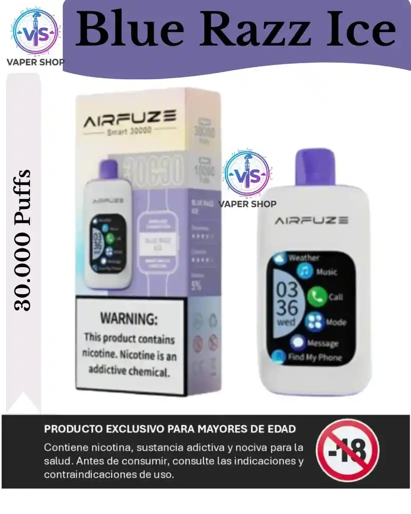 Experimenta el futuro del vapeo con el vapeador AIRFUZE Smart 30K Puff desechable Presentamos el AIRFUZE Smart 30K Puff Disposable Vape: el dispositivo pionero de vapeo inteligente que combina tecnología avanzada y una comodidad excepcional. Este dispositivo innovador ofrece una impresionante capacidad de 30.000 caladas e integra conectividad para smartphones, reproducción de música y funciones similares a relojes inteligentes, estableciendo un nuevo estándar en el mundo del vapeo. Pantalla táctil TFT de 2": Una pantalla táctil TFT de 2" vibrante y sensible permite un control intuitivo y una navegación fluida de todas las funciones inteligentes. Integración de smartphones y música: Realizar y recibir llamadas: Gestiona las llamadas directamente a través de tu dispositivo de vapeo para máxima comodidad. Música de reproducción: Disfruta de sonido de alta calidad mientras te llevas. Compartir fotos: Comparte fácilmente tus momentos favoritos. Encuentra mi teléfono: No vuelvas a perder tu teléfono con esta práctica función. Tres modos de vapeo: Suave: Para una sesión de vapeo suave y sin problemas. Normal: Un modo equilibrado para uso diario. Impulso: Para un golpe intenso y potente. Funciones: Líquido para e-líquido de 20 ml prellenado: Disfrute duradero sin necesidad de recargas. Batería recargable: Garantiza que tu dispositivo esté siempre listo cuando tú lo estés. Número de inhalaciones: Aproximadamente 30.000 bolsillos. Pantalla táctil inteligente: Navegación sencilla y control de tu experiencia de vapeo. Conexión inalámbrica a tu teléfono móvil: Mantente conectado y entretenido. Ajuste de salida de 3 niveles: Adapta tu experiencia de vapeo con los modos Soft, Normal y Boost. 5% (50mg) de concentración en nicotina: Para una experiencia satisfactoria y completa. Carga USB Tipo-C: Carga rápida y eficiente (cable no incluido). Activar el robo: Uso sencillo y cómodo. Vapeo MTL: Perfecto para vapear boca a pulmón. Mejora tu experiencia de vapeo con el vapeador AIRFUZE Smart 30K Puff Desechable. ¡Compra ahora en VapoRider y disfruta de la combinación definitiva de tecnología avanzada y comodidad!
