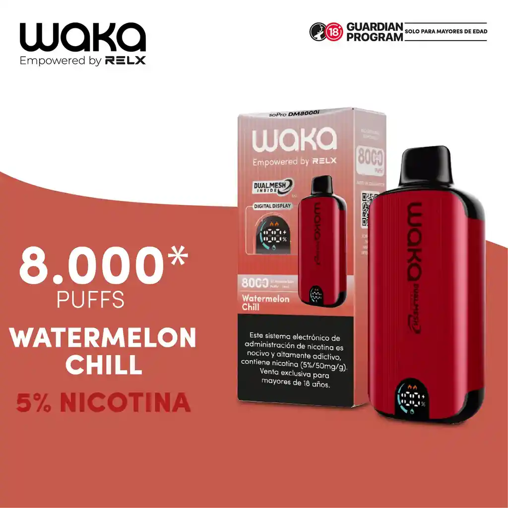Este vaporizador desechable ofrece unas impresionantes 8000 caladas de sabor veraniego a sandía con un relajante toque helado. Además, cuenta con tecnología de malla dual y modo de impulso para una experiencia de vapeo prolongada y satisfactoria. Los desechables WAKA DM8000i están diseñados para un solo uso.