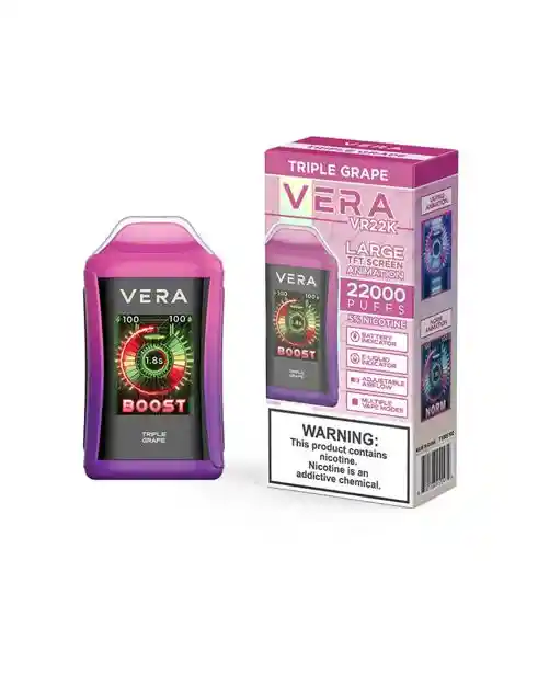 • Vaper desechable con sabor a triple uva. • Pantalla que muestra el estado de la batería y el nivel de la esencia. • Cambio de potencia. • Puffs 22000. • Nicotina 5%. • Batería recargable.