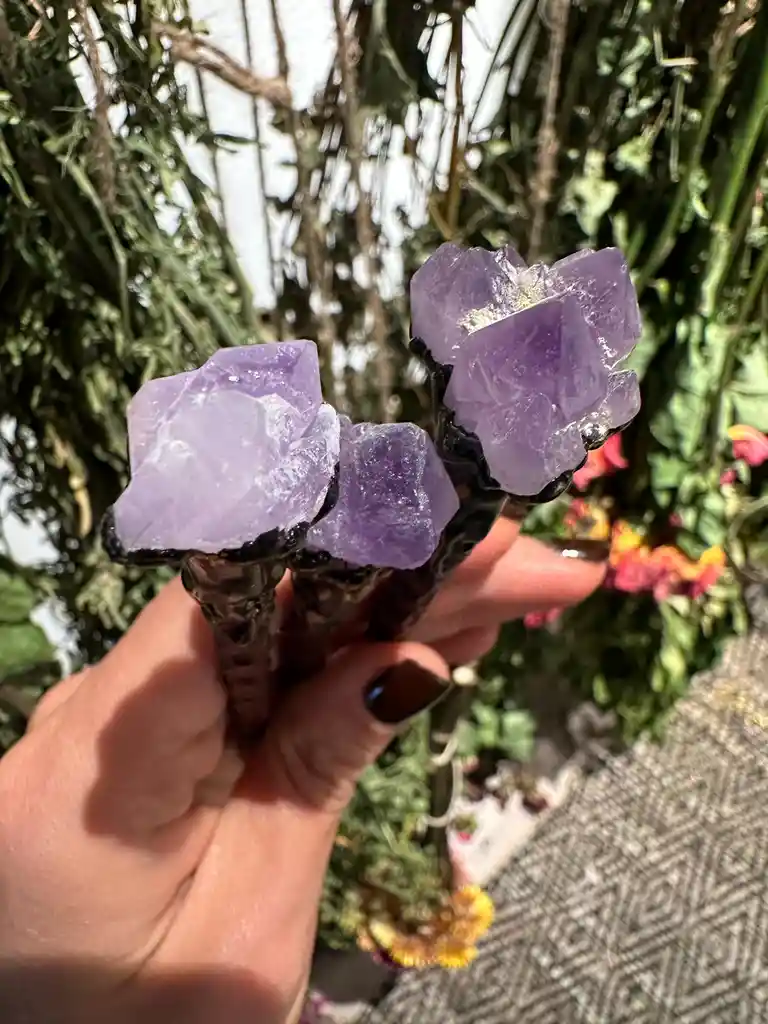 Forjada con la esencia de la naturaleza, esta varita mágica está hecha de roble, un árbol sagrado asociado con la fuerza, la protección y la conexión con lo divino. Su punta de amatista potencia la intuición y la claridad espiritual, convirtiéndola en una herramienta poderosa para dirigir energía en rituales. ¿Cómo usarla? - Para trazar círculos mágicos y delimitar espacios sagrados. - Para canalizar energía al manifestar intenciones o lanzar hechizos. . Para dirigir el humo de inciensos y sahumerios en limpiezas energéticas. - Para conectar con guías espirituales en meditaciones y lecturas oraculares. - Para potenciar la carga energética de amuletos, cuarzos o velas al tocarlos con la varita.