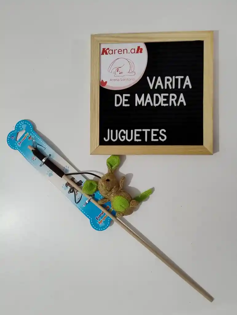 Juguete para gatos, varita en madera de 40cm con cordon de 90cm aprox, muñeco relleno de guata.