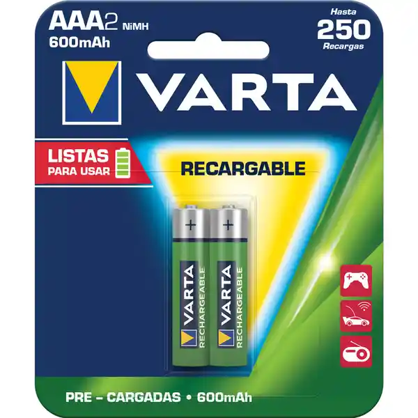 Set x2 pilas recargables Varta AAA, precargadas y listas para usar. Capacidad: 650 mAh. Soportan hasta 250 recargas y retienen hasta el 75% de su capacidad después de 12 meses de almacenamiento. Ideales para juguetes, radios, controles remotos y otros equipos de alta demanda. Vida útil estimada de hasta 5 años, según uso.