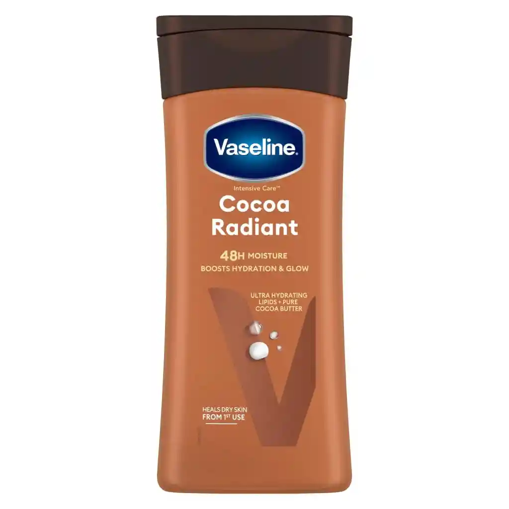 La loción radiante de cacao de cuidado intensivo Vaseline hidrata la piel para un brillo radiante y duradero. Ideal para pieles secas y ásperas. Formulada con manteca de cacao pura y lípidos ultrahidratantes que fortalecen la barrera cutánea y reponen la humedad. Clínicamente probada para proporcionar un 90% más de humedad (en comparación con la piel no tratada). Se absorbe rápidamente para dejar tu piel hidratada sin sentirse grasosa. Utiliza la loción corporal radiante de cacao Vaseline Intensive Care como tu loción diaria para pieles secas y ásperas. Presentación 295ml