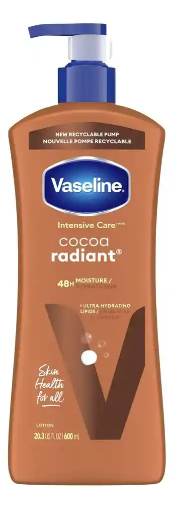 Vaseline Loción corporal de cuidado intensivo para piel seca, loción radiante de cacao hecha con lípidos ultrahidratantes y manteca de cacao pura para un brillo radiante de larga duración, 600ml Para un brillo duradero: la loción radiante de cacao de cuidado intensivo Vaseline hidrata la piel para un brillo radiante y duradero. Esta loción corporal para piel seca está formulada con manteca de cacao pura y lípidos ultrahidratantes que fortalecen la barrera cutánea y reponen la humedad. Esta crema hidratante corporal está clínicamente probada para proporcionar un 90% más de humedad (en comparación con la piel no tratada). Sensación no grasosa: esta loción de acción rápida se absorbe rápidamente para dejar tu piel hidratada sin sentirse grasosa. Cuidado diario de la piel: utiliza la loción corporal radiante de cacao Vaseline Intensive Care como tu loción diaria para pieles secas y ásperas. Simplemente aplíquelo sobre su piel para una hidratación duradera y una piel notablemente más saludable. La salud de la piel es esencial para el bienestar. Estamos ayudando a los desatendidos a cuidar mejor su piel.