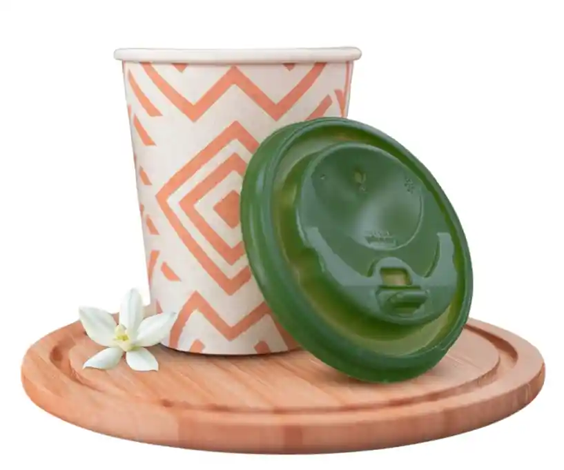 Vaso Ecológico de Caña de azúcar con tapa Viajera de PET reciclado . Capacidad 9 onzas ó 255 gramos El color de la tapa puede variar SIN AVISO. Perfecto para empacar bebidas calientes y despacharlas por Rappi el más usado por los restaurantes para café, te caliente y más Reciclable.