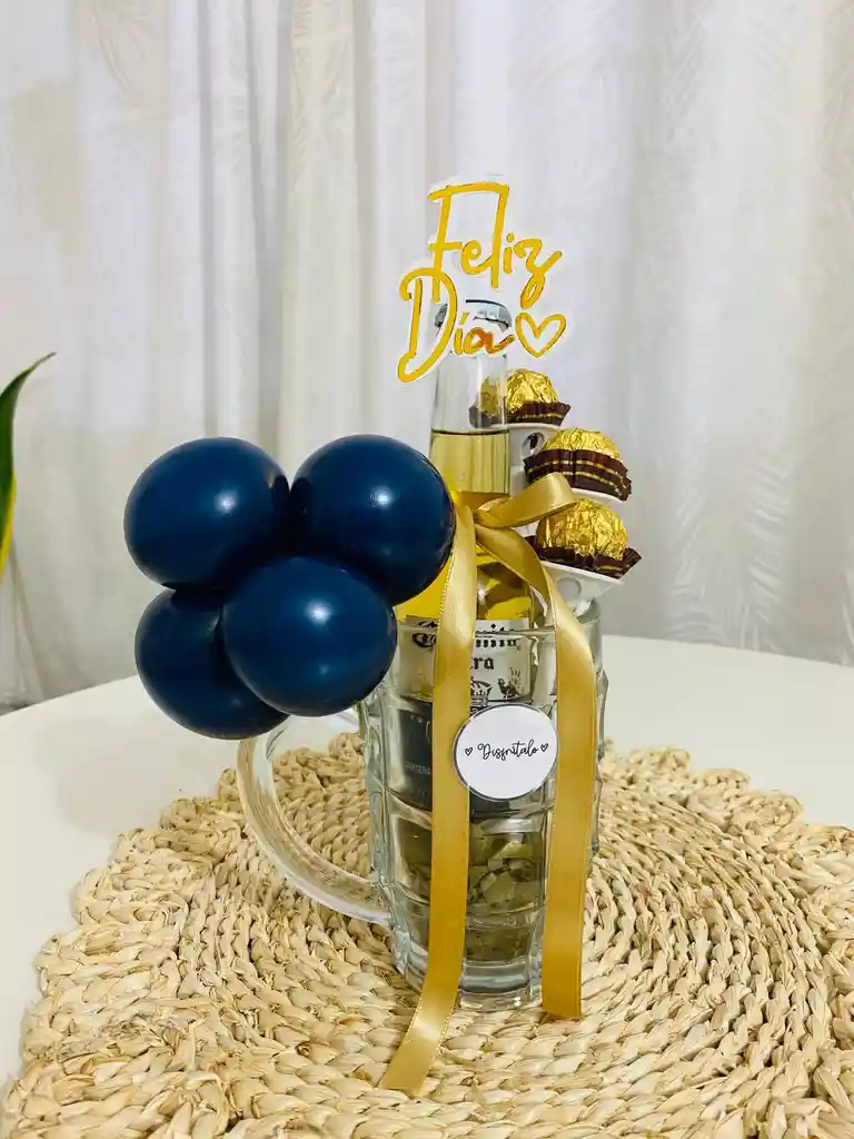 Espectacular y elegante Vaso Cervecero con Cerveza Coronita y trío de Ferrero Rocher, decoración y tarjeta Feliz día del Hombre