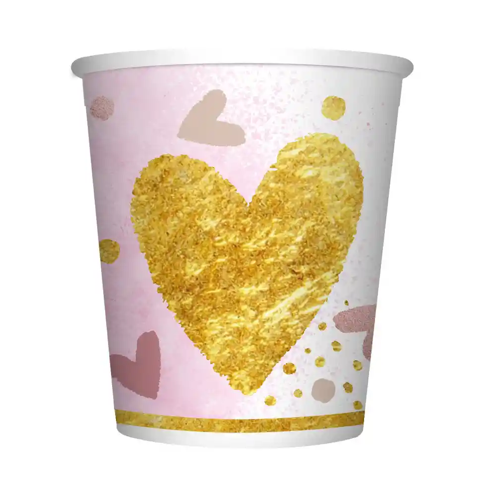 VASO 9 ONZAS TEMA CORAZONES BRILLANTES CONTIENE 8 VASOS DE CARTON