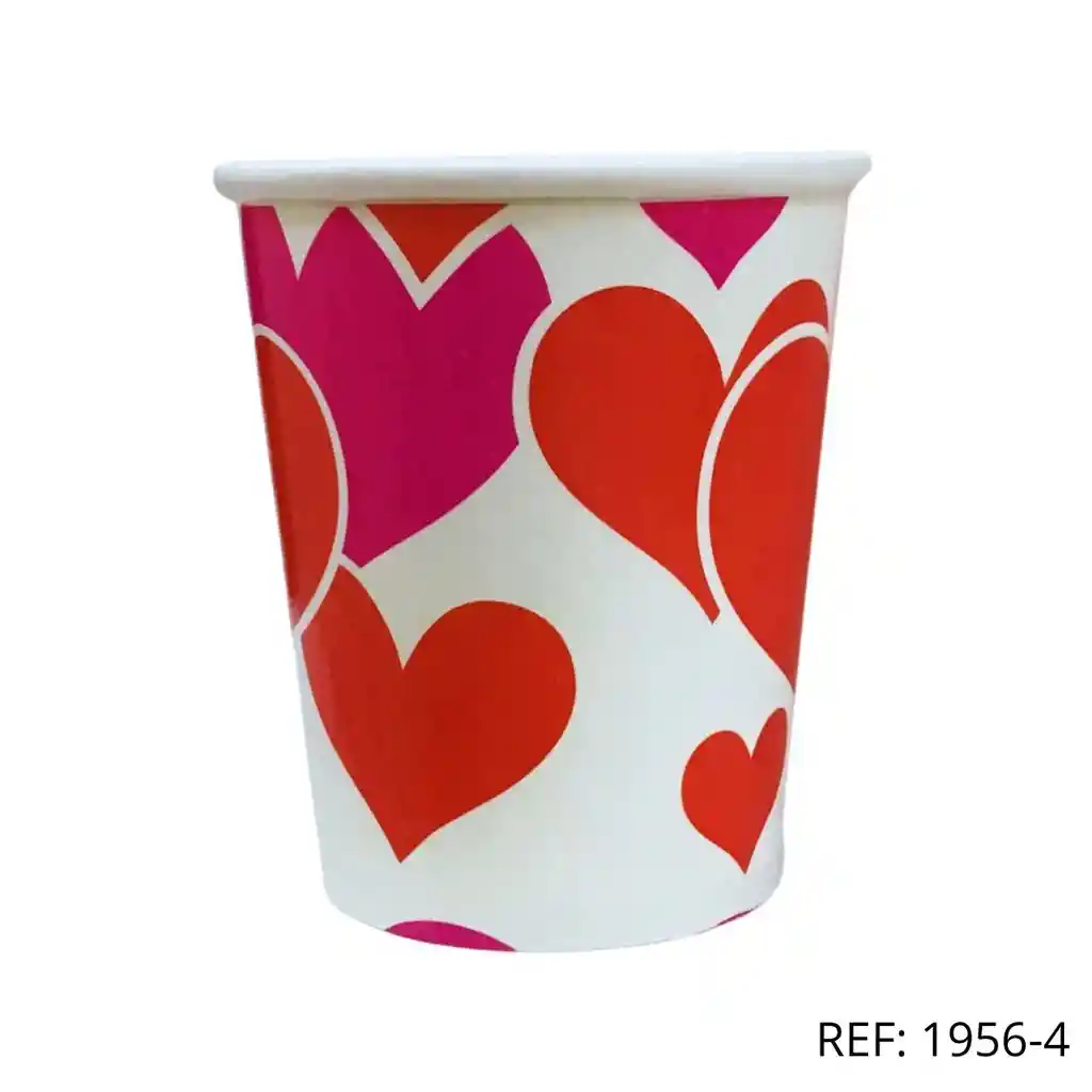 Vaso de cartón desechable con estampado de corazones rojos y fucsias. Perfecto para amor y amistad o celebraciones especiales.