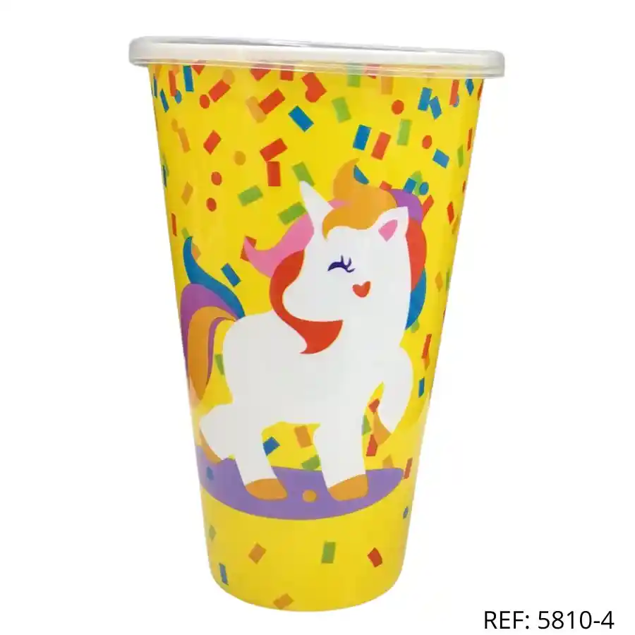 Vaso con tapa y diseño de unicornio sobre fondo amarillo. Colorido, resistente y perfecto para fiestas o uso diario.